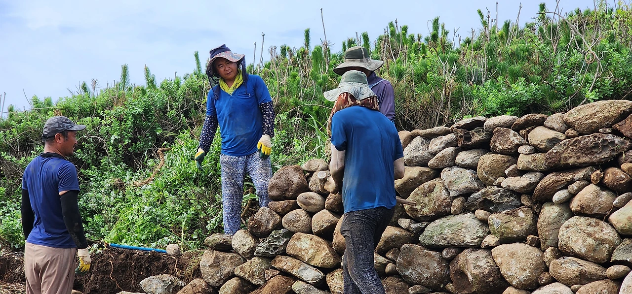 직윈이 빙그레 웃으며 아내가 본토에 갔다가 이번 배로 들어오는데 나에게 줄 선물이 있다고 조금만 기다리란다. 시간을 보니 배가 들어오려면 20분쯤 남아있다. 나는 잽싸게 돌담작업하는 곳으로 자전거를 달렸다. 작업장에 도착했는데 어느새 오늘 작업이 끝나 깨끗한 돌담이 세워져 있다.