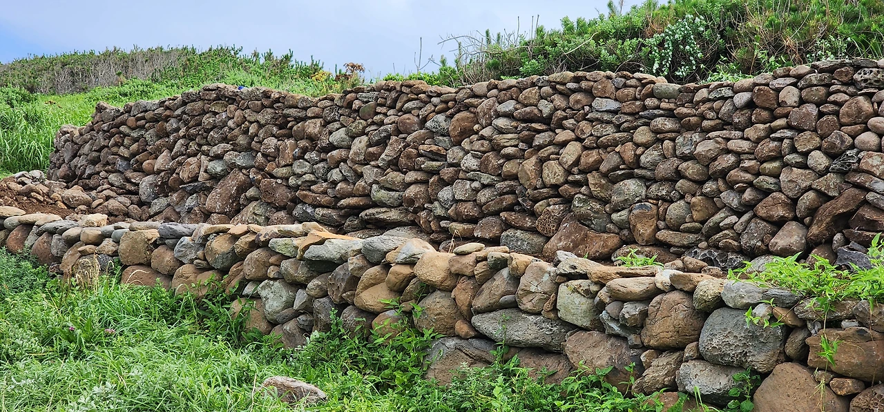 옆에서 이야기를 듣고 있던 작업반장처럼 보이는 분이, 쉰소리 집어치우라는 듯, 다시 작업을 종용한다. 나도 무안해져 몇 가지 정보를 얻고 자리에서 인사하고 물러난다. 한 번 돌담 작업을 하면 그 지역에서 숙식을 하면서 한 두 달 작업기간을 갖는다는 것, 하루 작업 종로시간을 대강 4시쯤이라는 것. (아마도 4시는 본토로 떠나는 뱃시간에 맞춘 것 같다.)