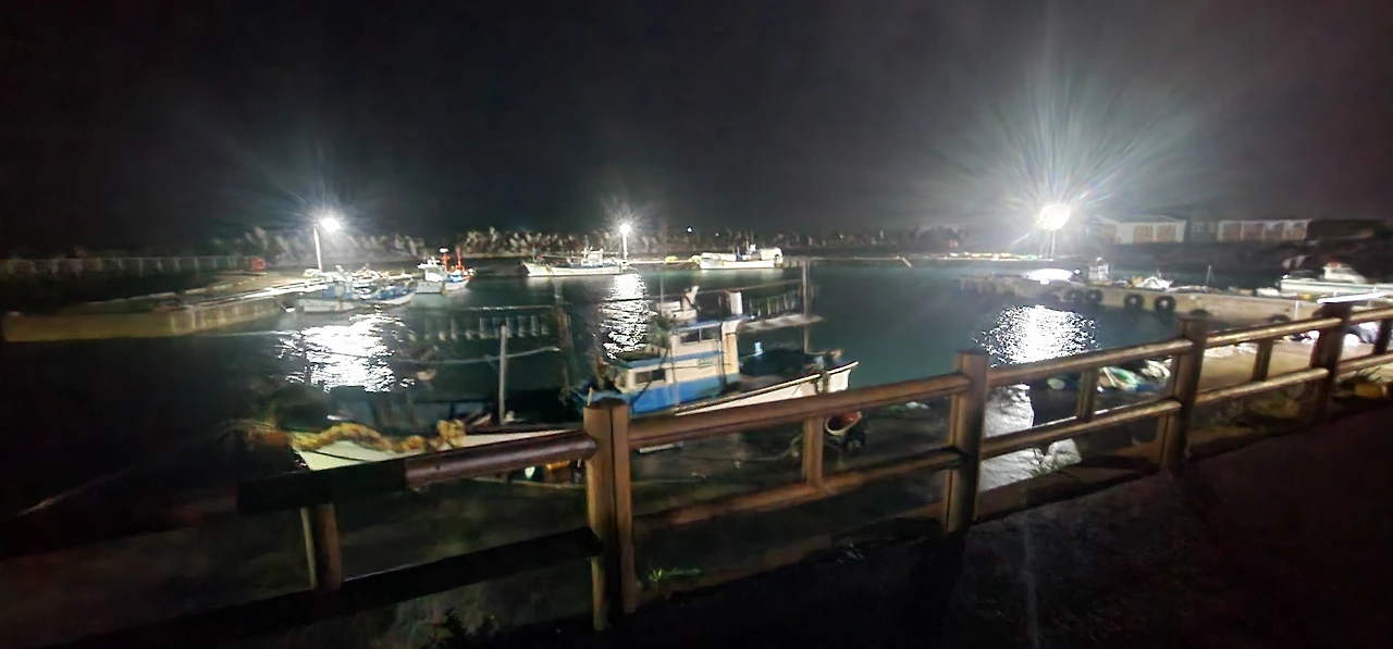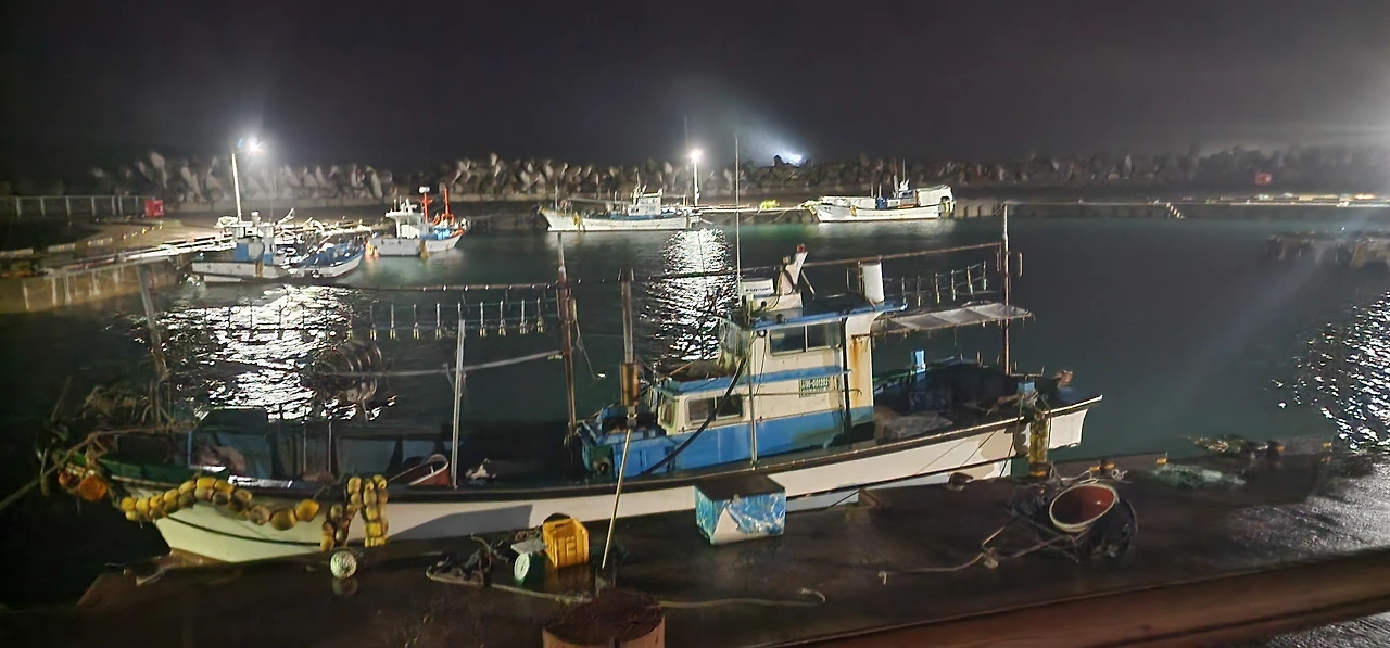 잠을 이룰 수 없을 것 같아, 비는 내리지만 밖으로 나가본다. 우산을 챙겼지만 강풍에 쓸모가 없을 것 같다. 해안가로 나와 비를 맞으며 걷는다. 하동 선착장에 작은 배들이 정박해 있다. 배는 안전해 보인다.