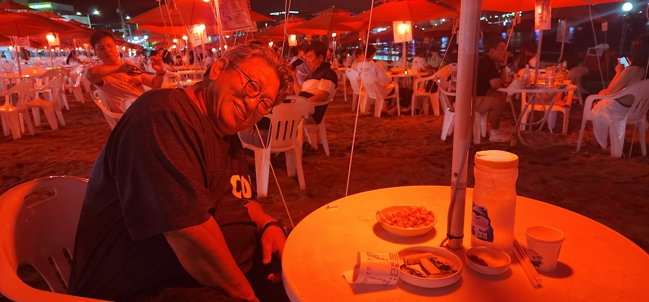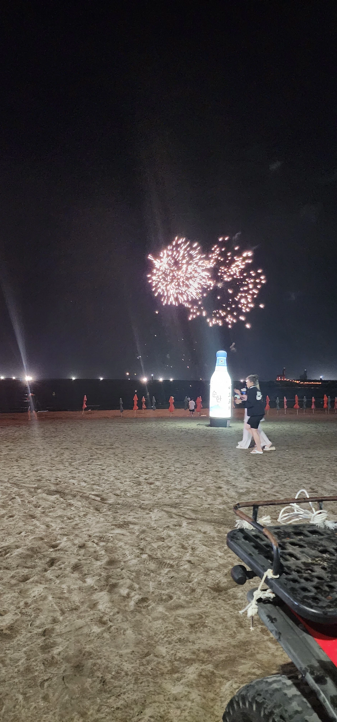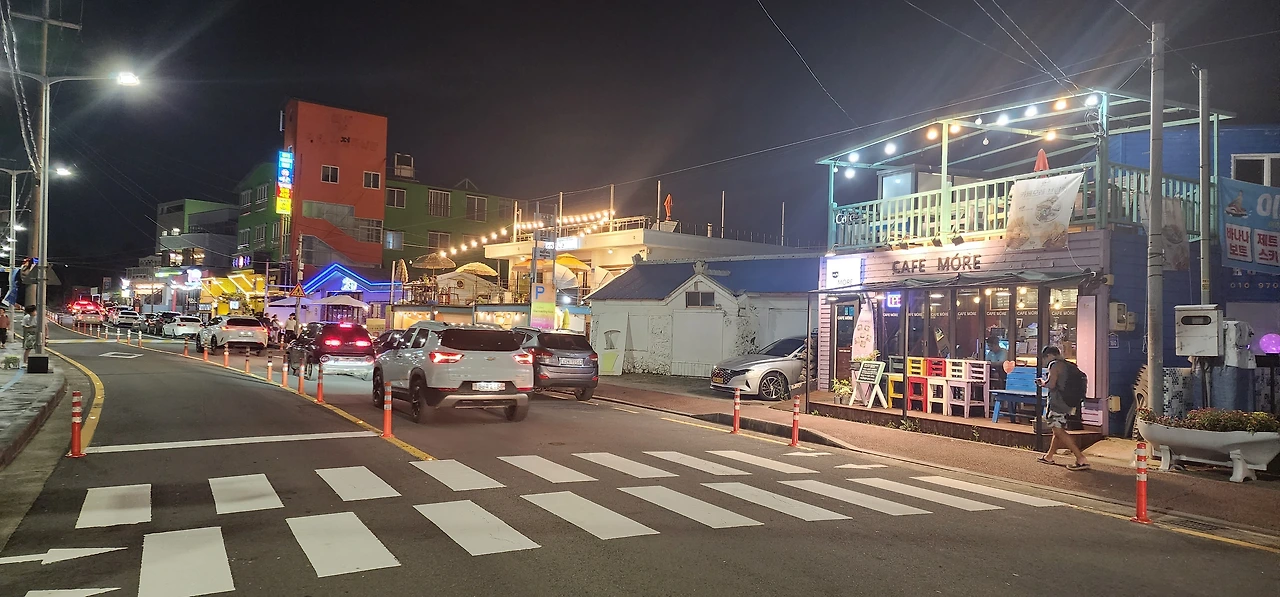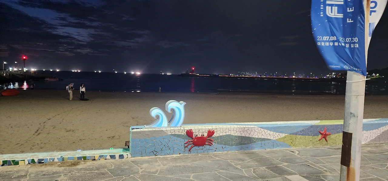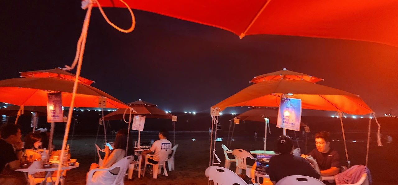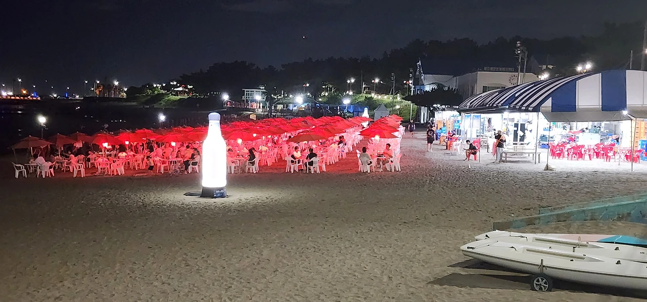 숙소에 도착하여 짐을 풀고, 샤워를 시원하게 하고 밤에 해안가로 나간다. 해안가 상가들이 화려하게 불을 켜고 관광객의 발길을 기다리고, 해안가 모래사장에 나란히 붉은 파라솔이 펼쳐지고 불이 밝혀진다. 근처에 있던 관광객들은 모두 여기로 모인 듯 불야성이다. 한쪽 해변에서는 젊은이들이 복죽을 터뜨리며 놀고 있다. 가파도로 들어가지 못한 우울함은 온데간데없고 이후테우의 흥성거림에 나도 모르게 살짝 젊은 시절로 돌아간 것 같다.