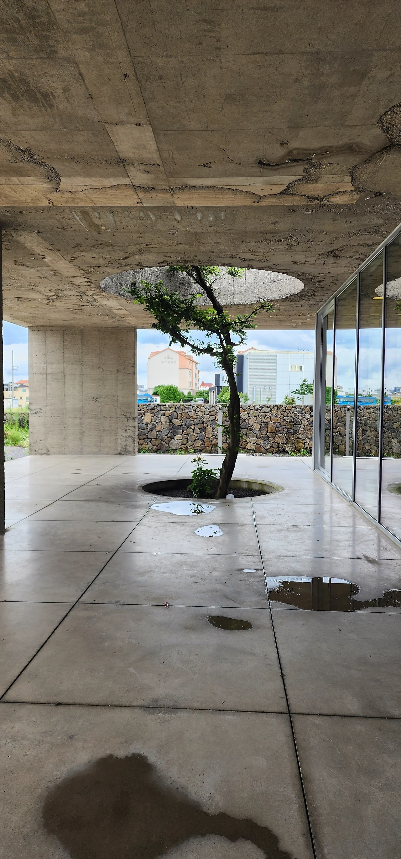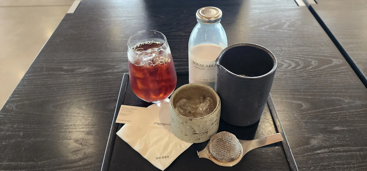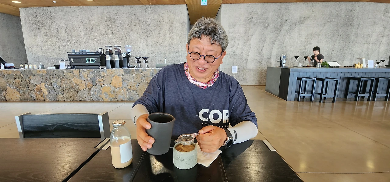 멀리서 볼 때는 밋밋해보였는데 가까이 갈수록 매력적인 건축물임을 느낄 수 있다. 거기에 드립커피와 밀크티는 워낙 명물이어서 젊은이들의 핫스폿이란다.(이런 정보는 제주도 원주민에게는 결코 얻을 수 없다. 오직 젊은 제주도 이주민만이 감지하는 정보다.^^) 나는 한 번도 시켜본 적이 없는 밀크티를 시켜봤다. 홍차가루에 밀크티를 넣고 우려내어 거름망에 걸러 먹는 이 차는 맛도 향도 좋다, 오늘 아주 대박이다. 제주도 맛집 천국 투어다.