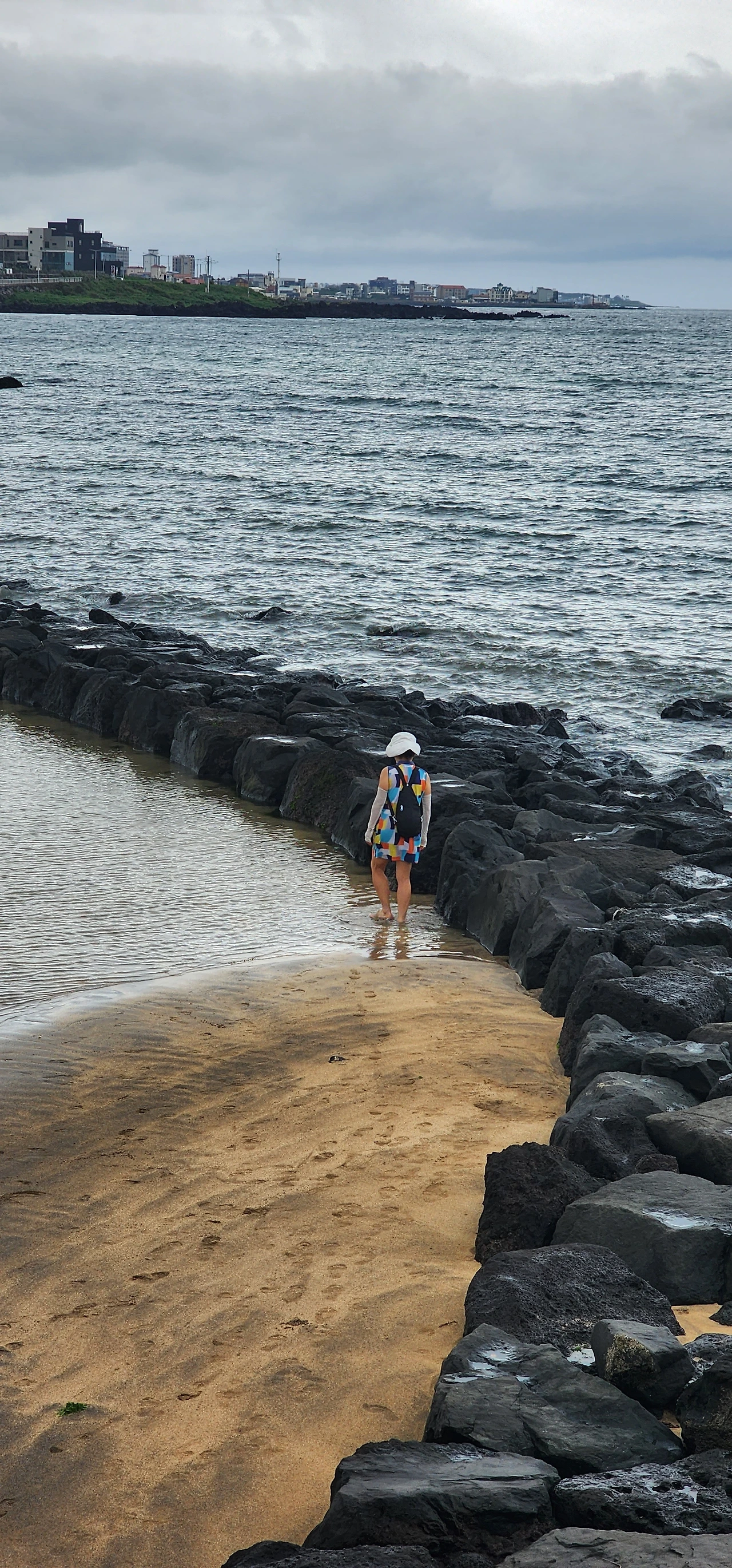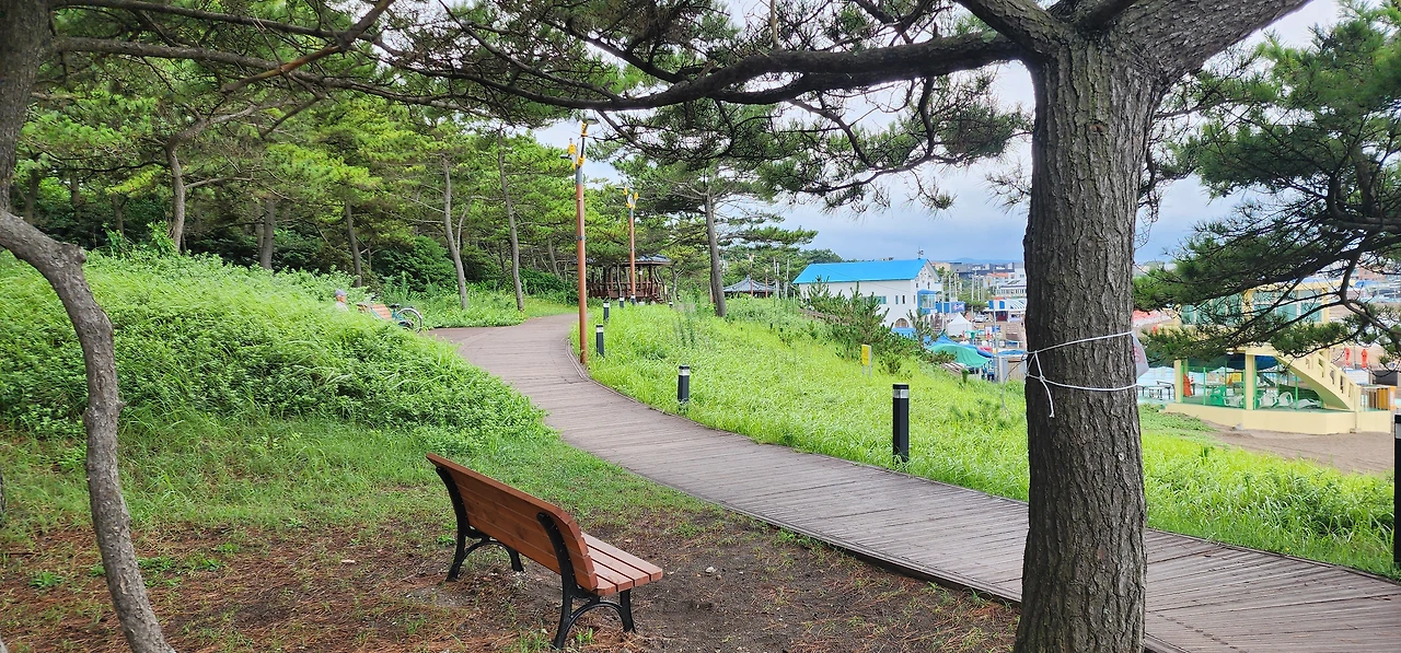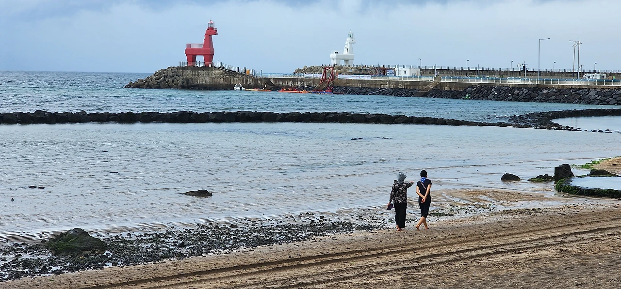 해변을 따라 맨발로 산책하는 분들도 있고, 나뭇길 산책로를 따라 산책하는 사람도 있다. 멀리 붉은 말과 하얀 말 모양의 등대가 보인다. 그리고 해변 한편에 돌로 둘러쳐진 확(밀물 때 몰려들어온 고기가 썰물 때 못 나오도록 가두는 장치)이 두 개나 있다. 그곳을 거쳐 등대까지 가보기로 한다. 갈 때는 해안가로, 올 때는 나뭇길 산책로로.