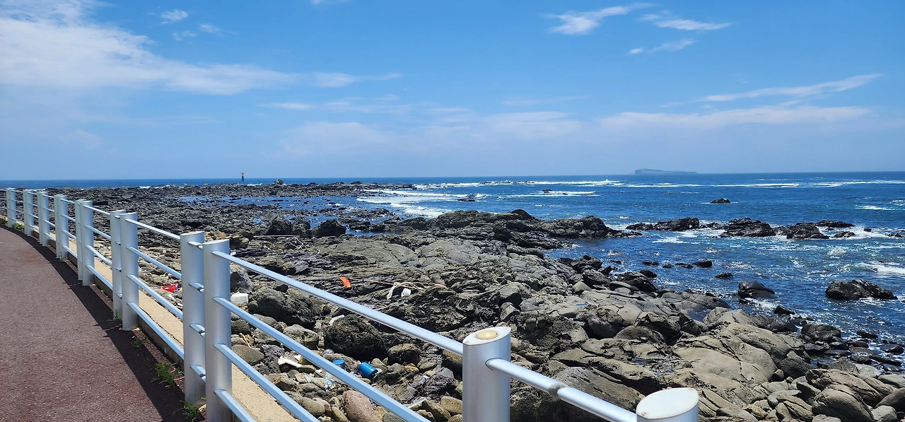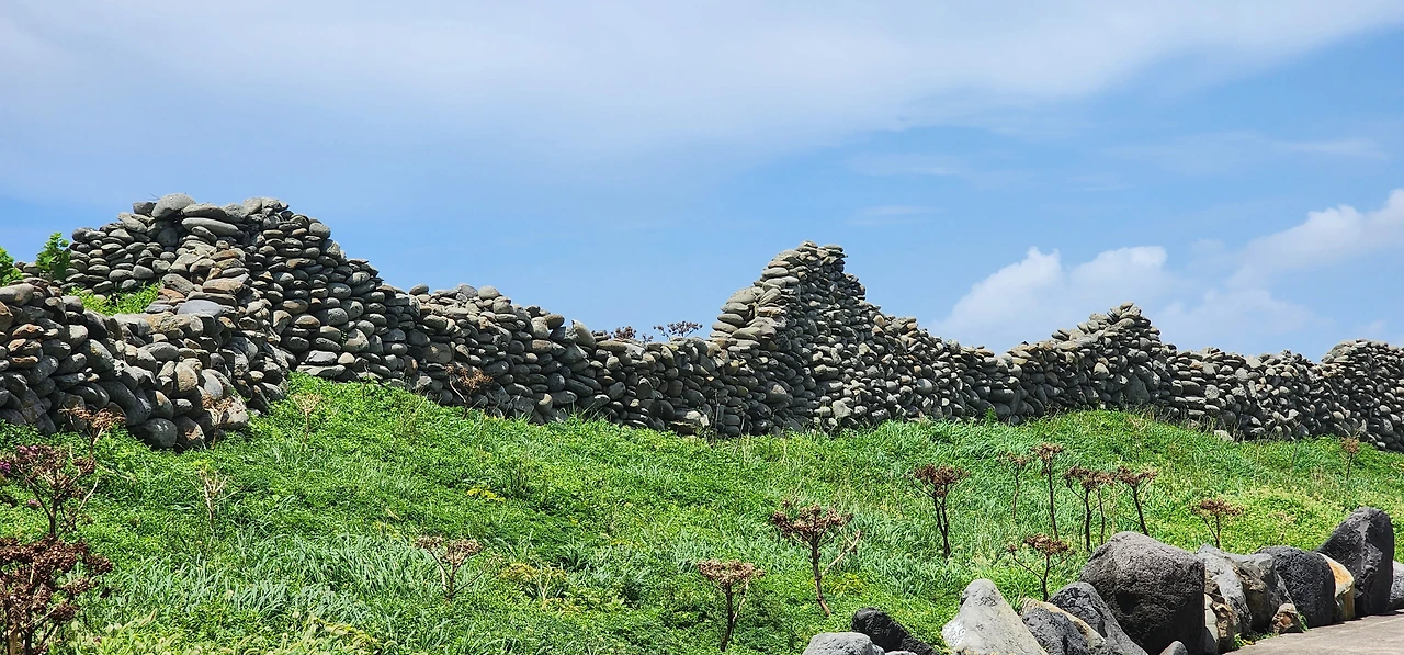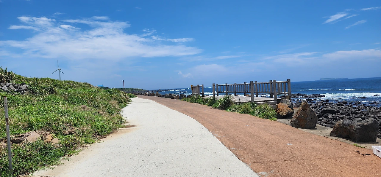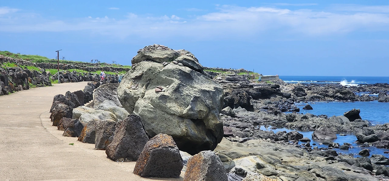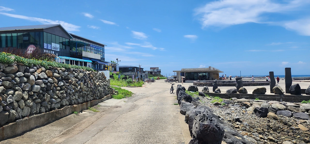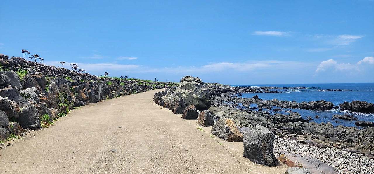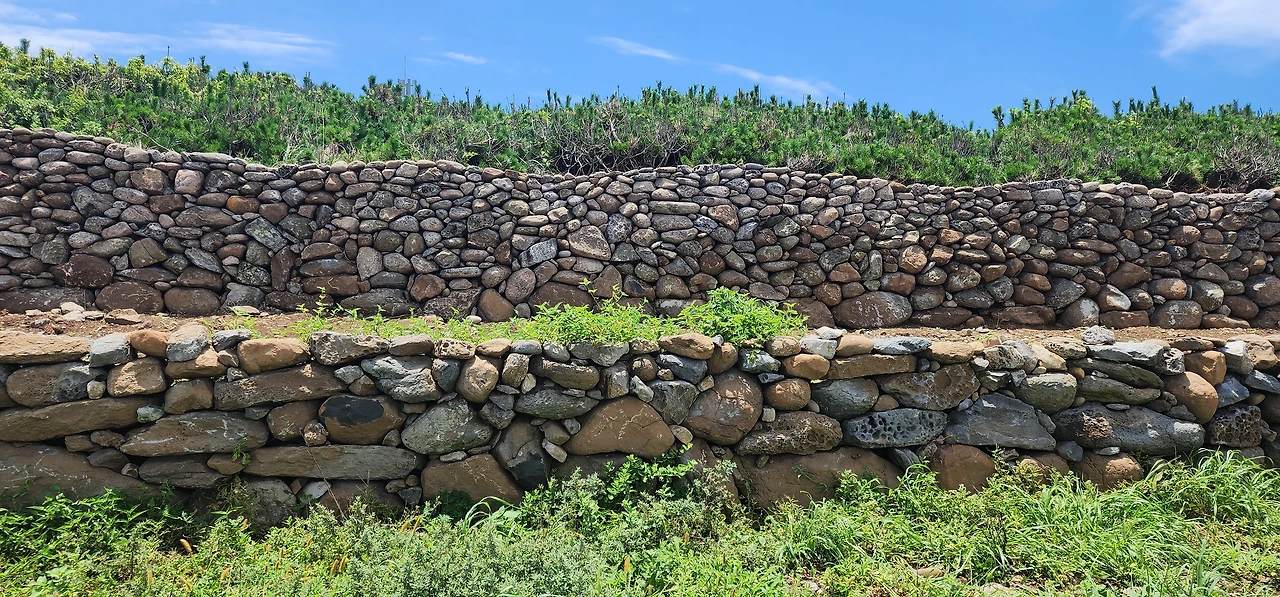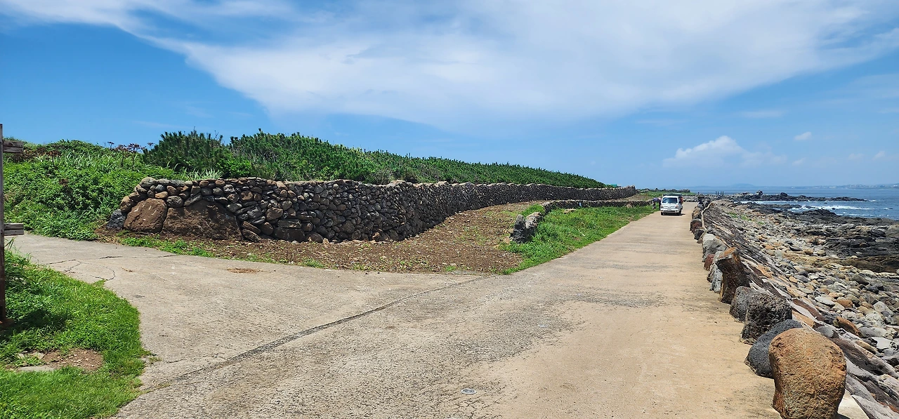 만약에 자전거를 탔다면 앞으로는 천국길이다. 아래로 경사로가 뻗기 때문에. 그래도 놓치지 알아야 할 것은 해안가 오른쪽에 쌓아놓은 제주도 전통돌담이다. (전쟁시에는 성벽의 역할을 하기도 했단다.) 자세히 보면 알겠지만, 전통돌담은 직선이 아니라 곡선으로 쌓았다. 자연스럽게 웨이브를 치는 돌담은 바람을 닮은 것인지 파도를 닮은 것인지 참 아름답다.