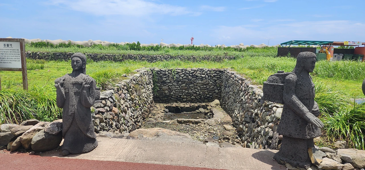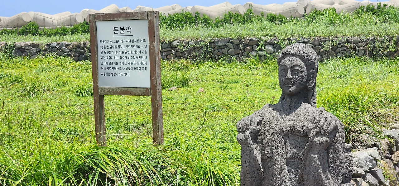 앞에 보이는 가게를 끼고 왼쪽 골목으로 돌아가면 식사나 간식을 해결할 수 있는 가게들과 기념품 가게들이 많다. 계속 가면 섬을 가로 지르는 길이다. 이제 하동 선착장에서 상동 쪽으로 가는 해안길이다. 먼저 눈에 띄는 곳은 돈물깍과 불턱이다. 돈물은 담수를 뜻하는 제주방언으로 담수가 솟아나는 곳이고, 가파도 아낙들이 이곳에서 식수를 기른 듯 하다. (몸집에 비해 커다랗게 과장된 여인의 손을 보라.) 불턱은 해녀들이 옷을 갈아입거나, 추운 날은 불을 피워 몸을 녹이던 곳이다. (해녀의 애환이 담긴 곳이라 할 수 있다.) 불턱 뒤로 보이는 곳이 하동 쓰레기 분리수거장이다.