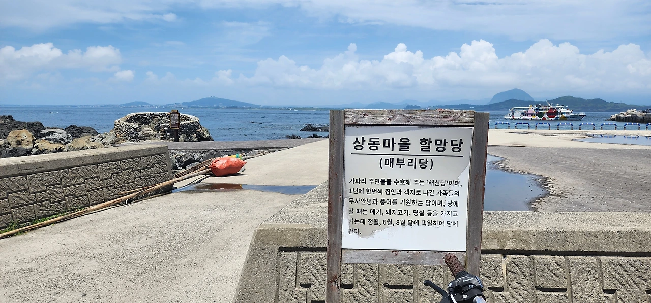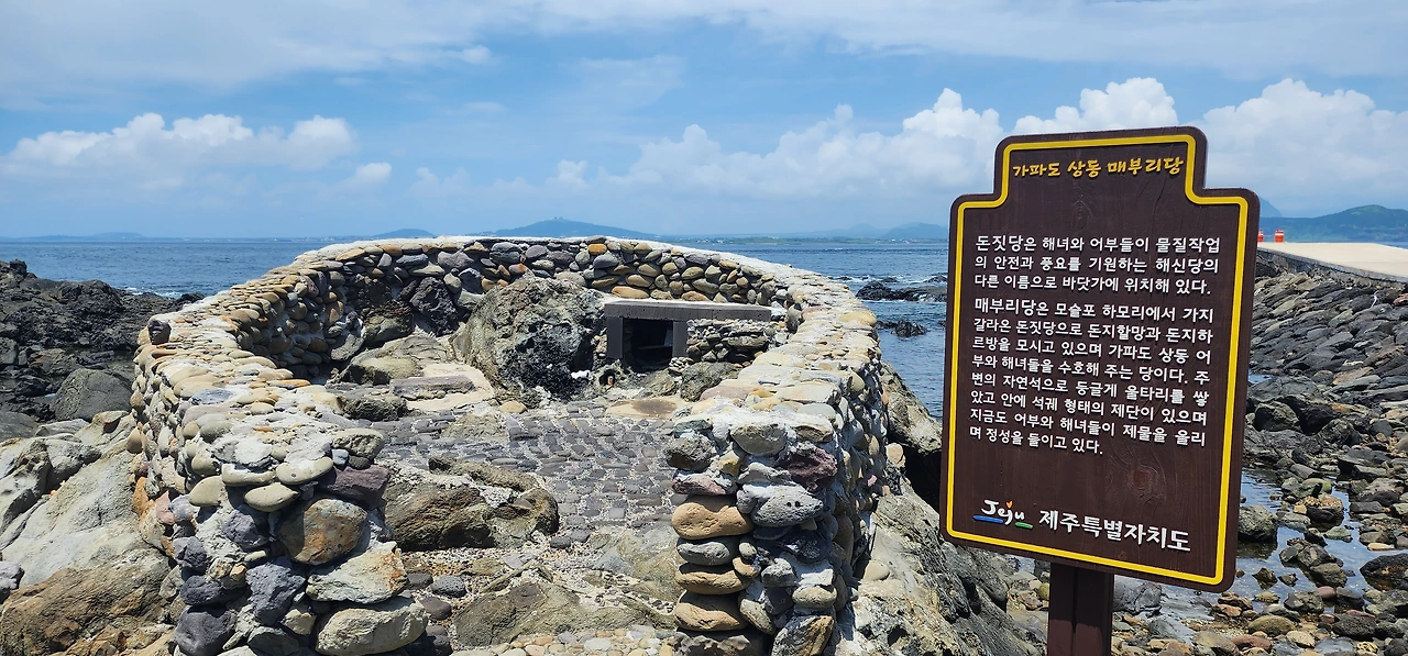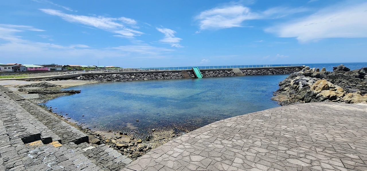 제일 먼저 보이는 것이 상동마을 할망당(매부리당)이다. 일 년에 한 번 집안과 객지로 나간 식구들의 안녕을 기원하는 곳이니, 여행의 안녕을 빌어보자. 좌측에는 인공으로 조성된 어린이 수영장이 있다. 엄청 큰 미끄럼틀이 있어 눈에 띌 것이다. 바닷물의 조수간만의 차이에 따라 수위가 달라지는 수영장이다.