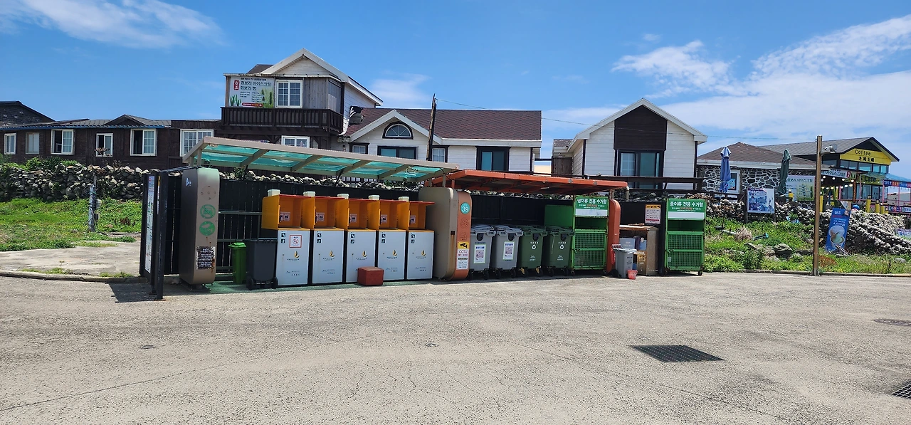 가파도에는 상동과 하동 두 군데 이렇게 쓰레기 분리수거장이 있다.조금만 더 가다 보면 길에 표시가 그려진 갈림길이 나온다. 왼쪽으로 꺾어 들어가면 섬의 중앙(남북)을 가로지르는 청보리밭과 벽화길이고, 오른쪽으로 직진하면 해안가 길이다. 오늘은 해안가 길로 고고!