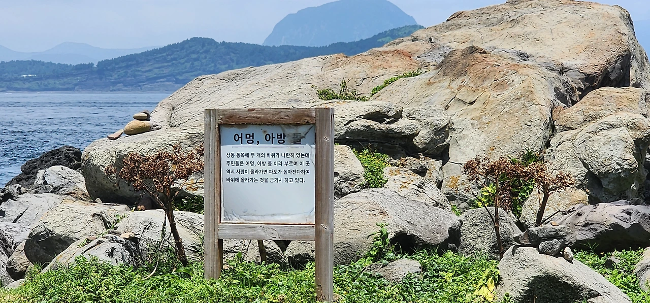 자, 이제 한 바퀴를 거의 다 돌았다. 매표소로 돌아가기 전에 어멍 아방 돌을 만날 것이다. 엄마 아빠처럼 나란히 서 있는 돌인데 이 돌에도 보름바위 처럼 올라가면 안 된다. 그냥 구경만 하자.