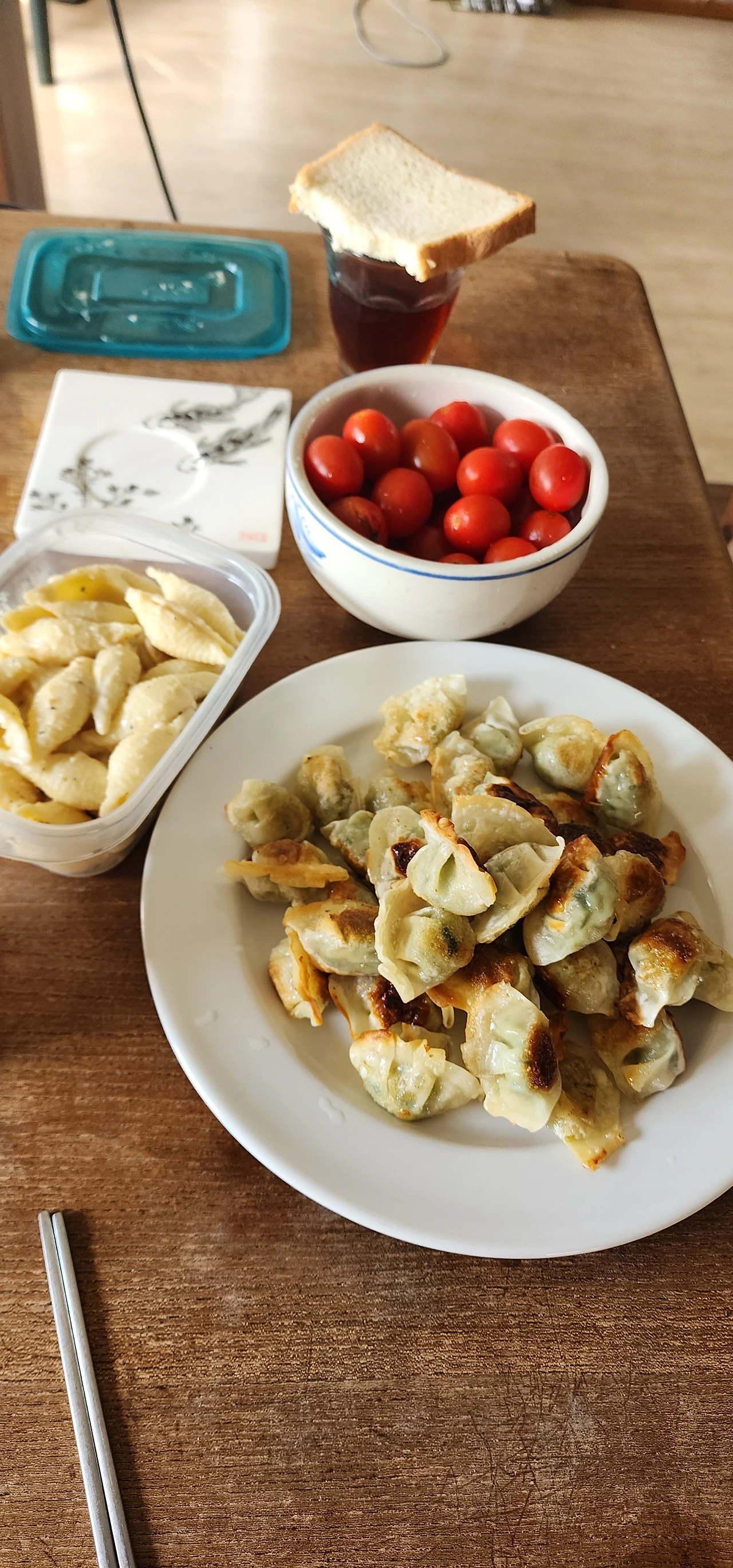 직원은 약속시간보다 조금 늦게 도착했다. 매표소에서 할 일이 남아 늦었다면서 쌀봉지와 팩우유 3개를 건넨다. (쌀이 거의 떨어져 조금만 달라고 미리 부탁했었다.) 나는 미리 만들어둔 군만두를 집에 가져다주라고 말했다. 그 사이에 또 만들겠다고. (며칠 전에 매표소 직원집과 내가 머무는 집은 지척지간이라는 것을 알았다.) 직원이 다녀오는 사이 급히 만두를 굽고, 방울토마토를 씻고, 커피를 꺼낸다. 조촐한 저녁상이 마련됐다.