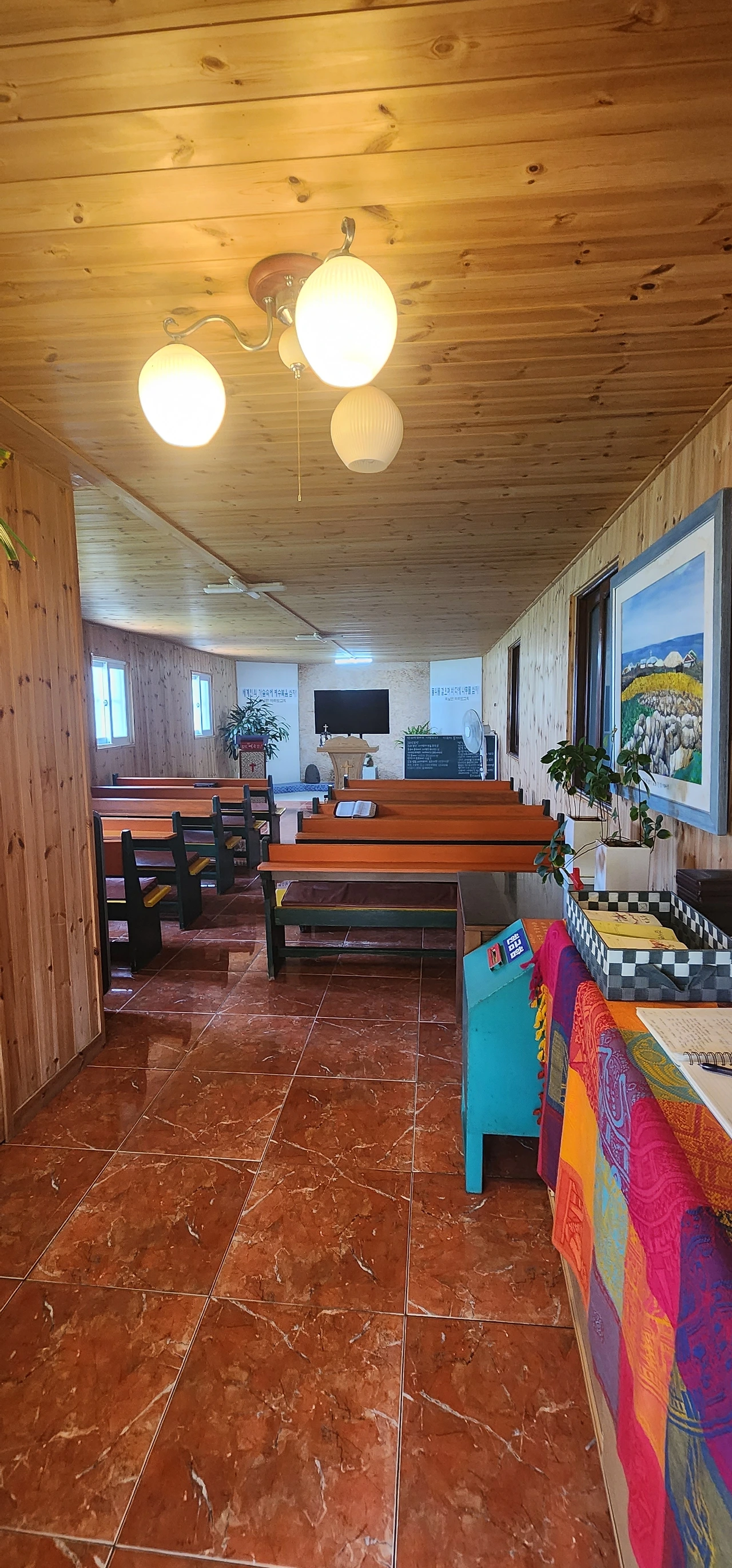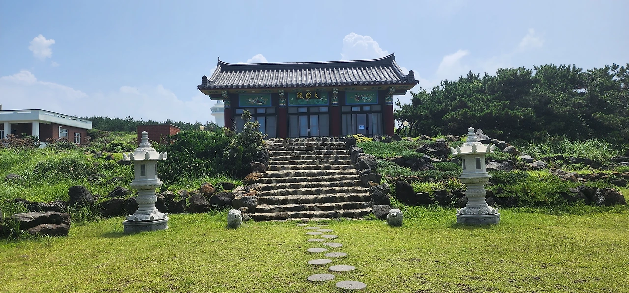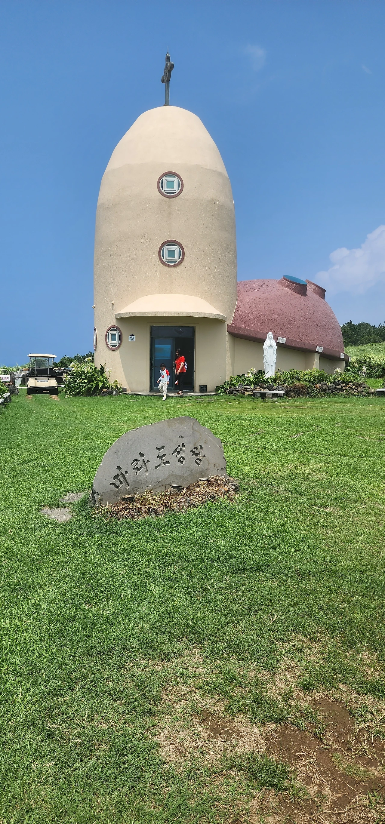 자, 이제 마라도 성당으로 가자. (오늘의 소박한 목표가 3개의 종교시설을 방문하는 것이다.) 5분 정도 경사진 곳을 오르니 옹기 위에 십자가를 올려놓은 것 같은 성당이 보인다. 이번에는 성녀 마리아 님께 인사하고 성당 안으로 들어간다. 입구에 성경필사 릴레이가 있어, 나도 한 구절 받아 쓴다. 그리고 안으로 들어가니 천장에 뚫린 구멍으로 들어오는 빛과 인공 등으로 만든 빛이 은은하게 어우러져 성당 분위기를 조성한다.(작지만 정성 들여 만든 성소임을 알 수 있다.) 나는 눈을 감고 모든 대한민국 국민의 건강과 안녕을 빌었다.
