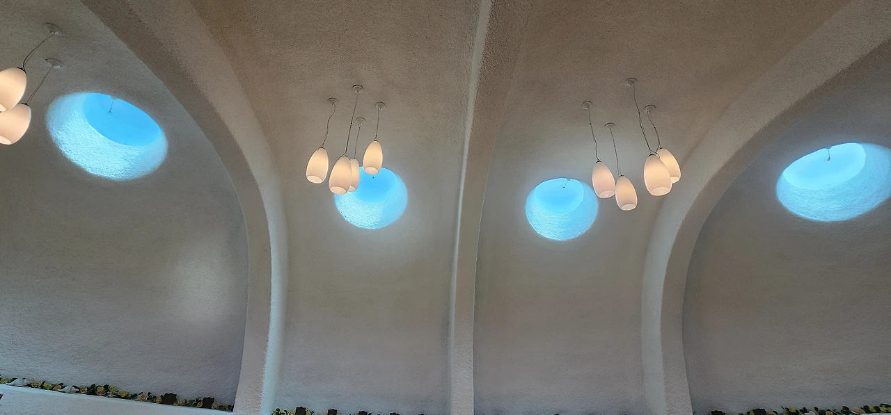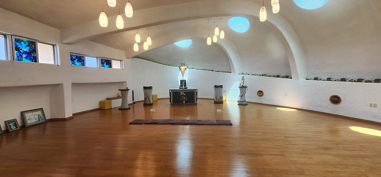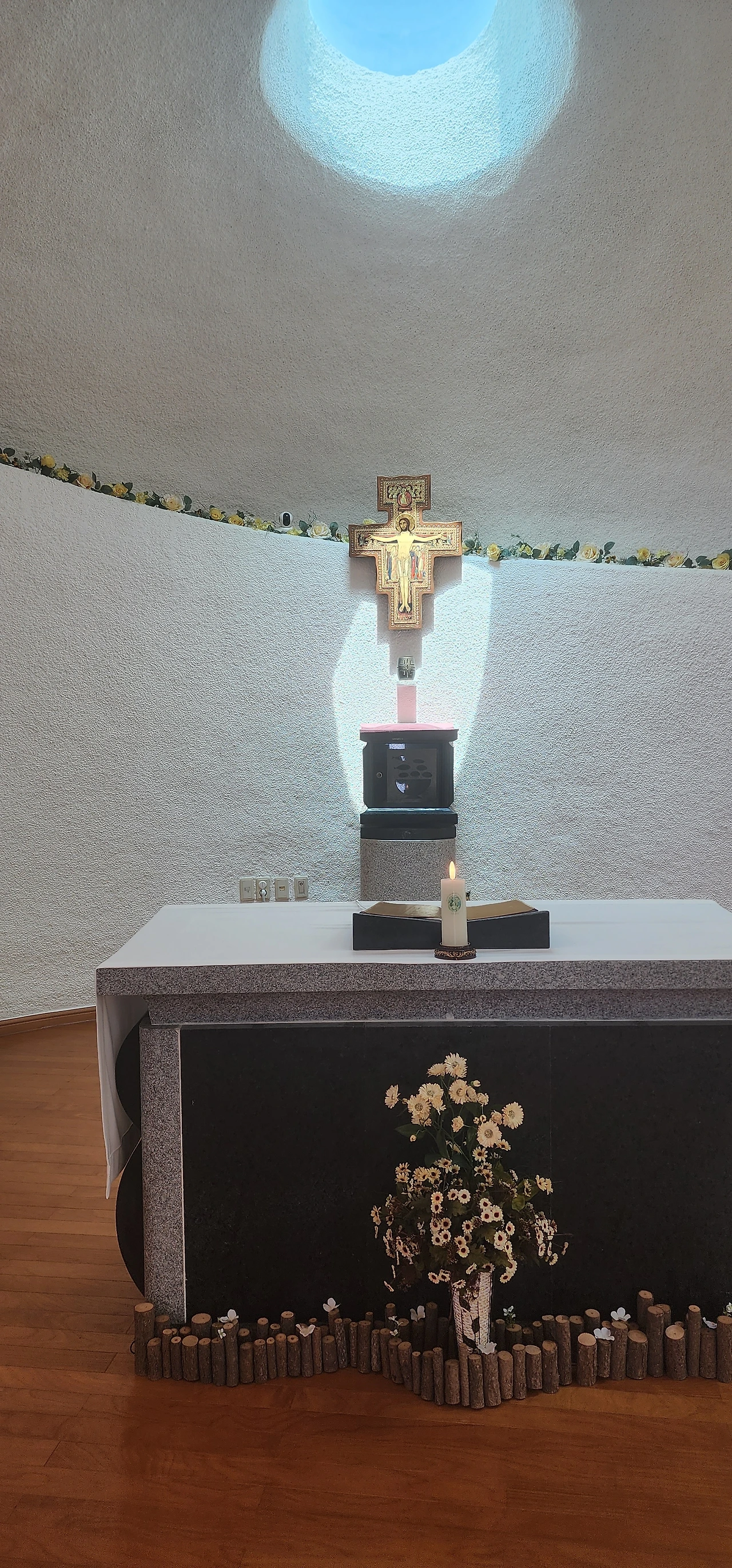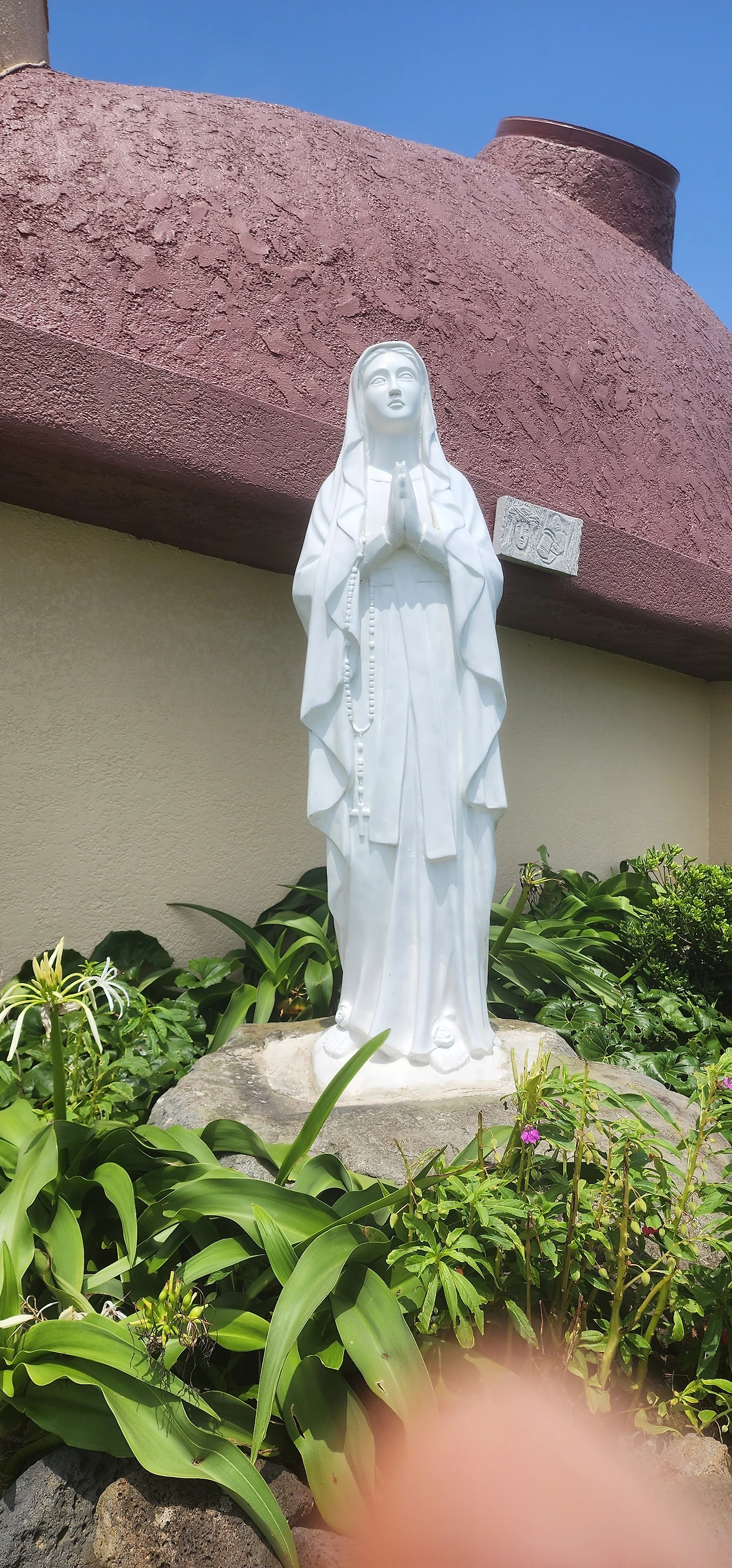 자, 이제 마라도 성당으로 가자. (오늘의 소박한 목표가 3개의 종교시설을 방문하는 것이다.) 5분 정도 경사진 곳을 오르니 옹기 위에 십자가를 올려놓은 것 같은 성당이 보인다. 이번에는 성녀 마리아 님께 인사하고 성당 안으로 들어간다. 입구에 성경필사 릴레이가 있어, 나도 한 구절 받아 쓴다. 그리고 안으로 들어가니 천장에 뚫린 구멍으로 들어오는 빛과 인공 등으로 만든 빛이 은은하게 어우러져 성당 분위기를 조성한다.(작지만 정성 들여 만든 성소임을 알 수 있다.) 나는 눈을 감고 모든 대한민국 국민의 건강과 안녕을 빌었다.