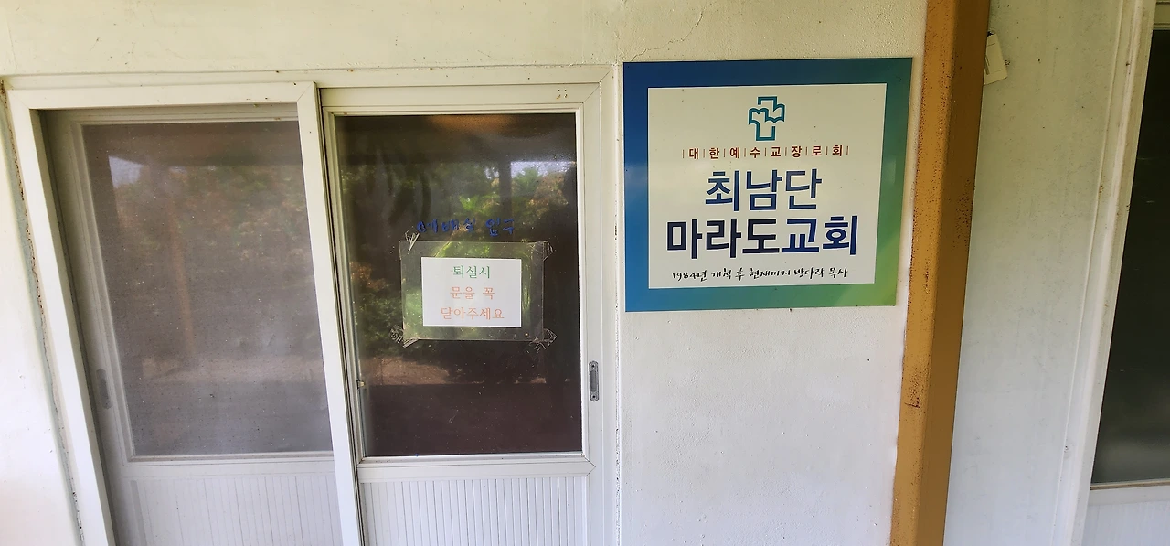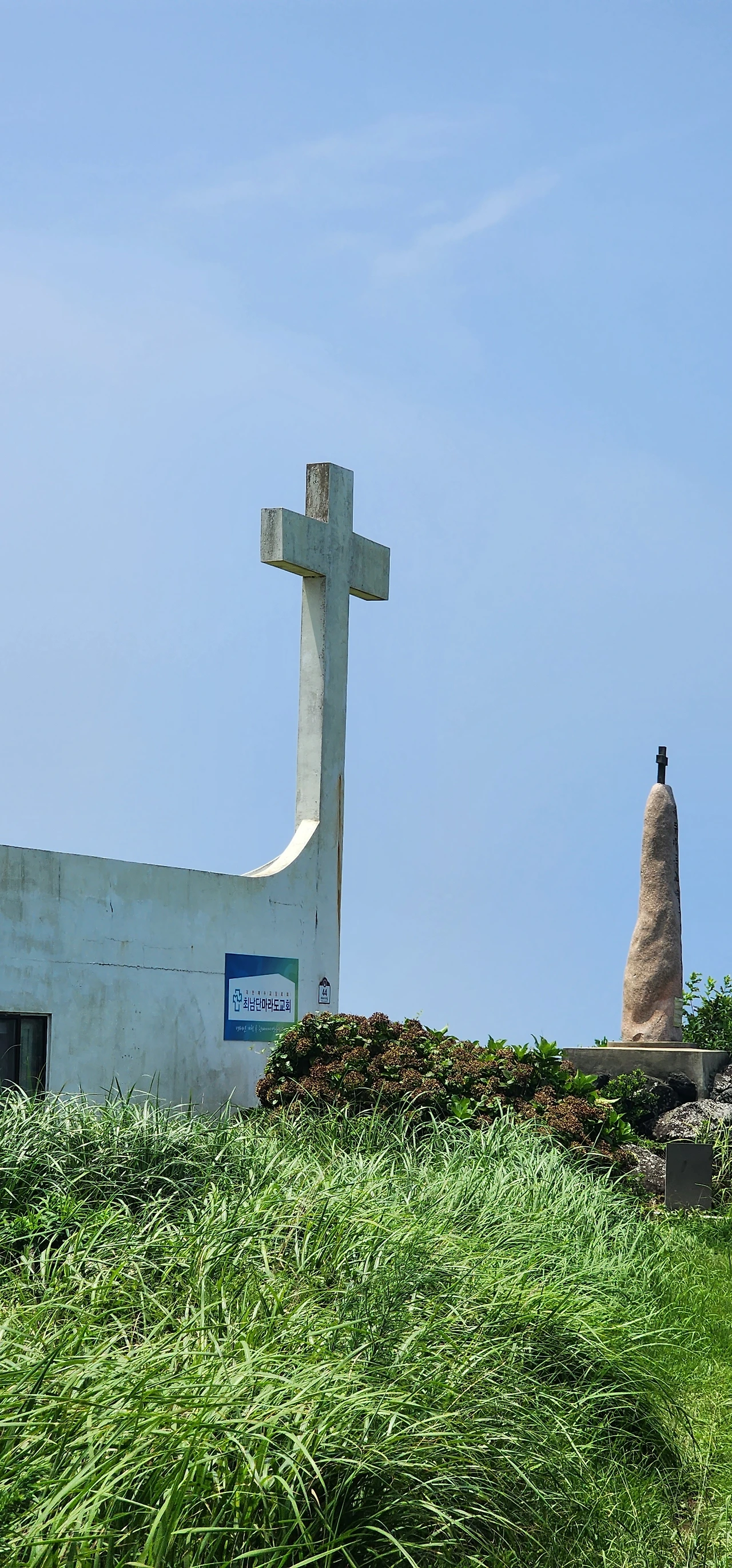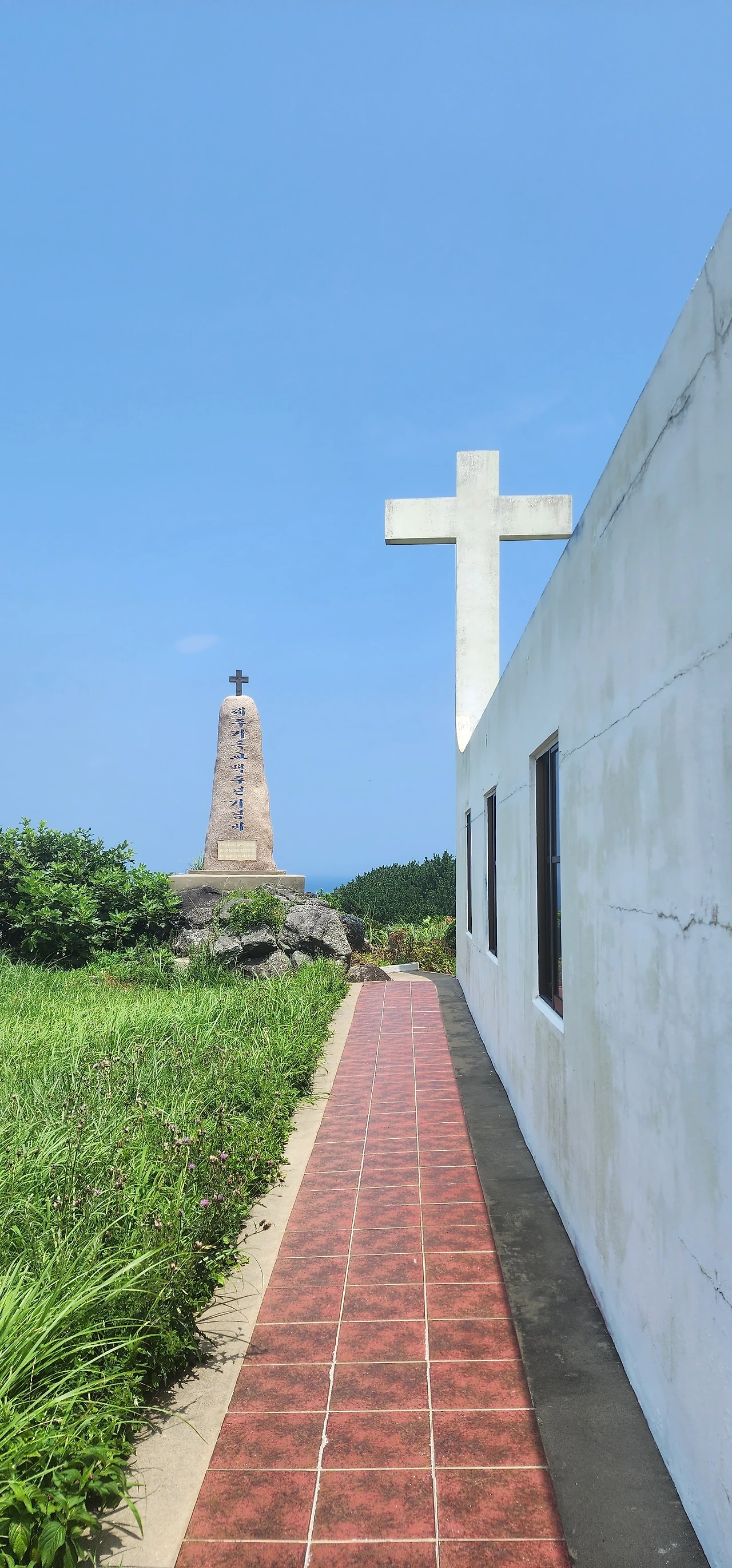 성당 옆에 있는 큰 건물이 우리나라 최남단 마라도 등대다. 가파도 등대보다 훨씬 규모가 크다. 심지어 전 세계의 등대 미니어처들이 동상처럼 등대 앞에 전시되어 있다. 그러나 내가 가야 할 곳은 마지막 종교시설 교회다. 지도를 보니 교회로 가려면 해안가로를 따라가면 안 된다. 담수장 골목으로 꺾어 들어가야 한다. 그러면 해안가를 4분의 1 정도 보지 못하게 되지만 과감하게 꺾어 교회로 향한다. 표지판이 없어 숲 속에 들어온 기분이다. 하지만 조금만 걸으면 교회의 십자가 2개가 눈에 들어온다. 하나는 교회 십자가이고 다른 하나는 제주 기독교 100주년 기념비에 딸린 십자가다. 교회에는 아무도 없다. 예배당 문을 열고 들어가지 않고 사진만 한 장 박는다. 특이할 게 아무것도 없는 그냥 작은 교회다. (마라도 교회뿐만 아니라 대한민국 개신교 교회들의 건축물 대부분 그렇다. 건축사적으로 남길 만한 게 별로 없다.)