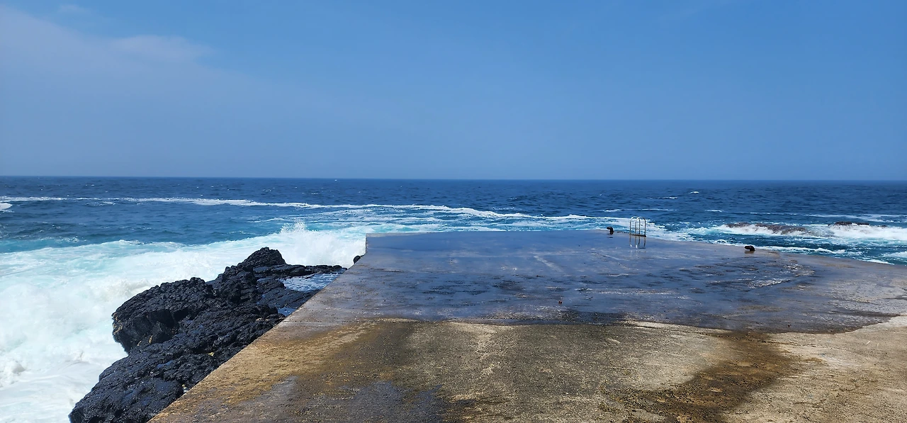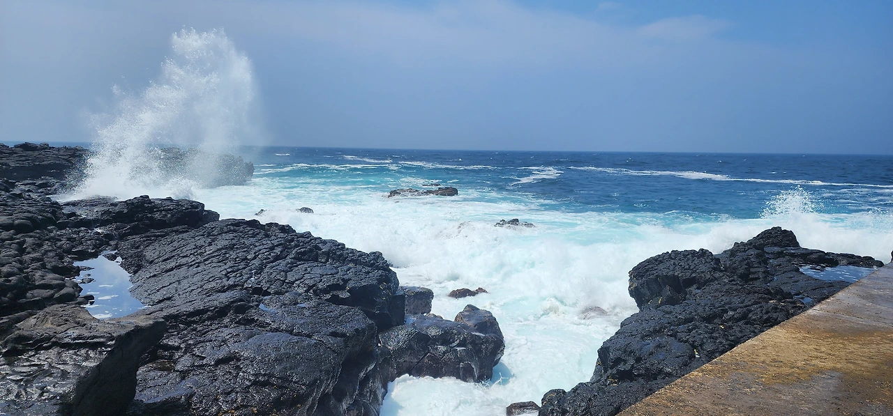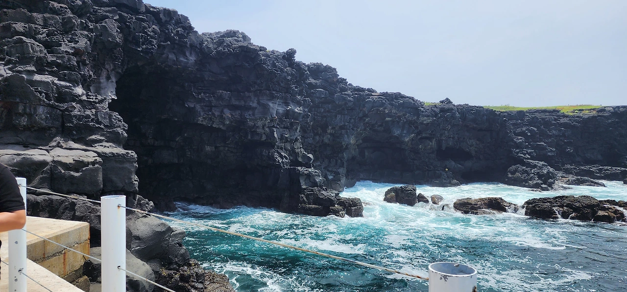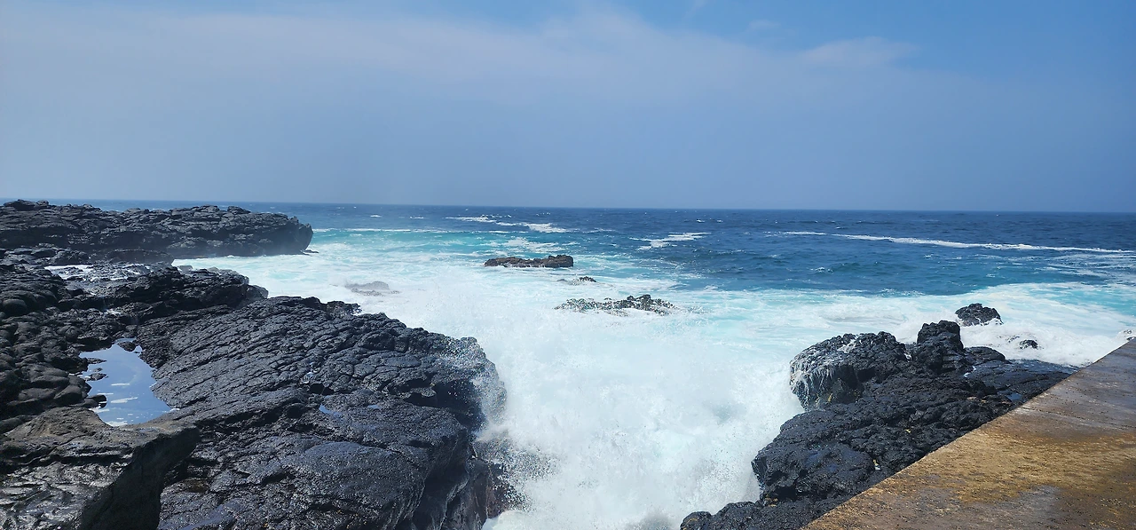 신작로 선착장에 도달했다. 여객선보다는 바지선이 들어오기 적합한 구조다. 주변 암석 위로 파도가 힘차게 친다. 한동안 넋을 잃고 파도를 구경한다.
