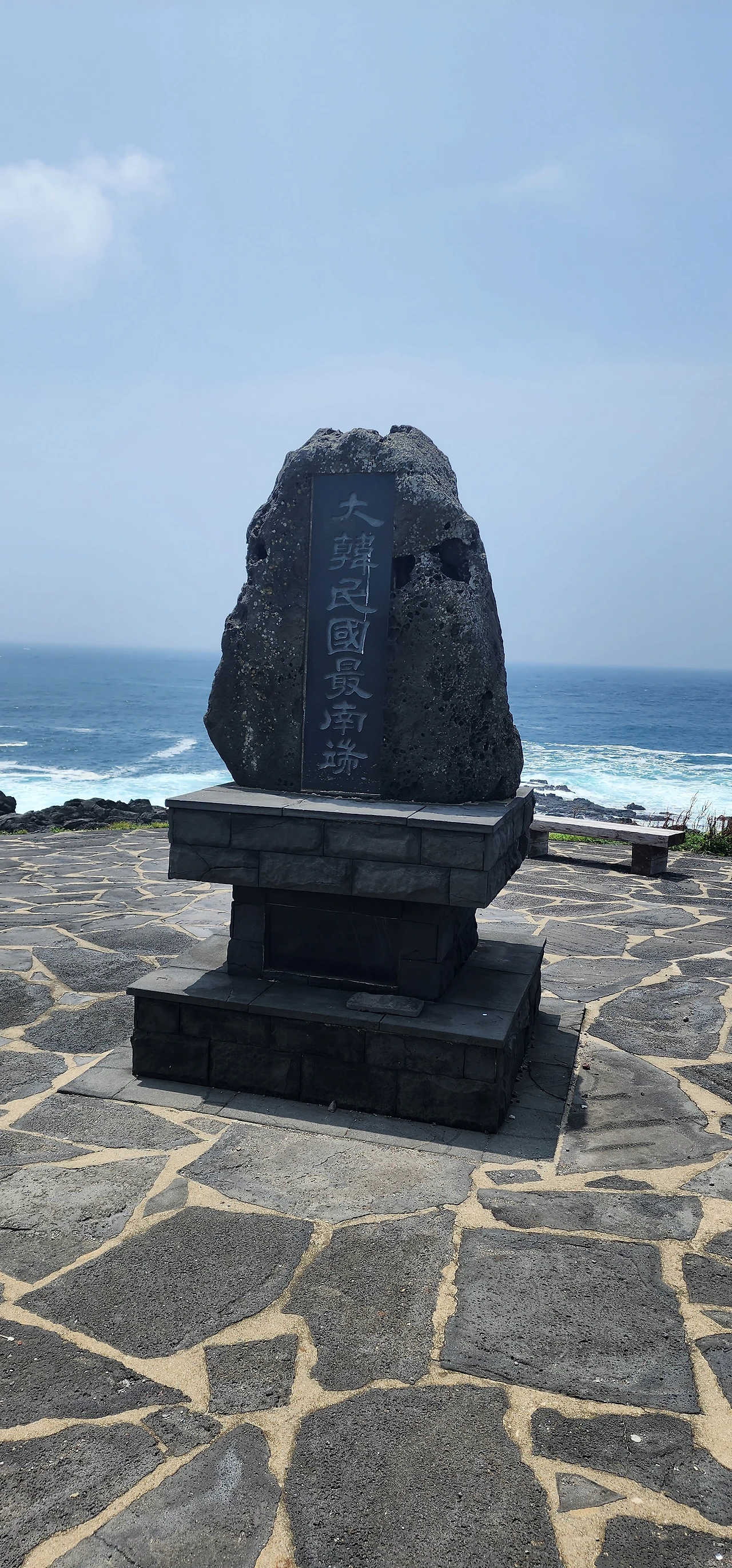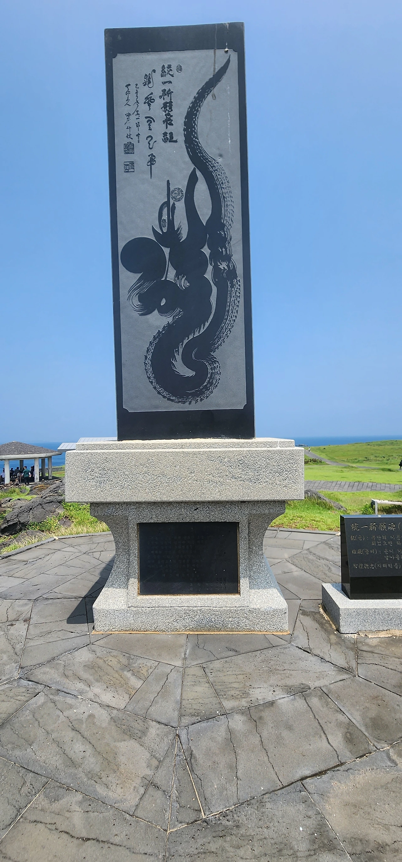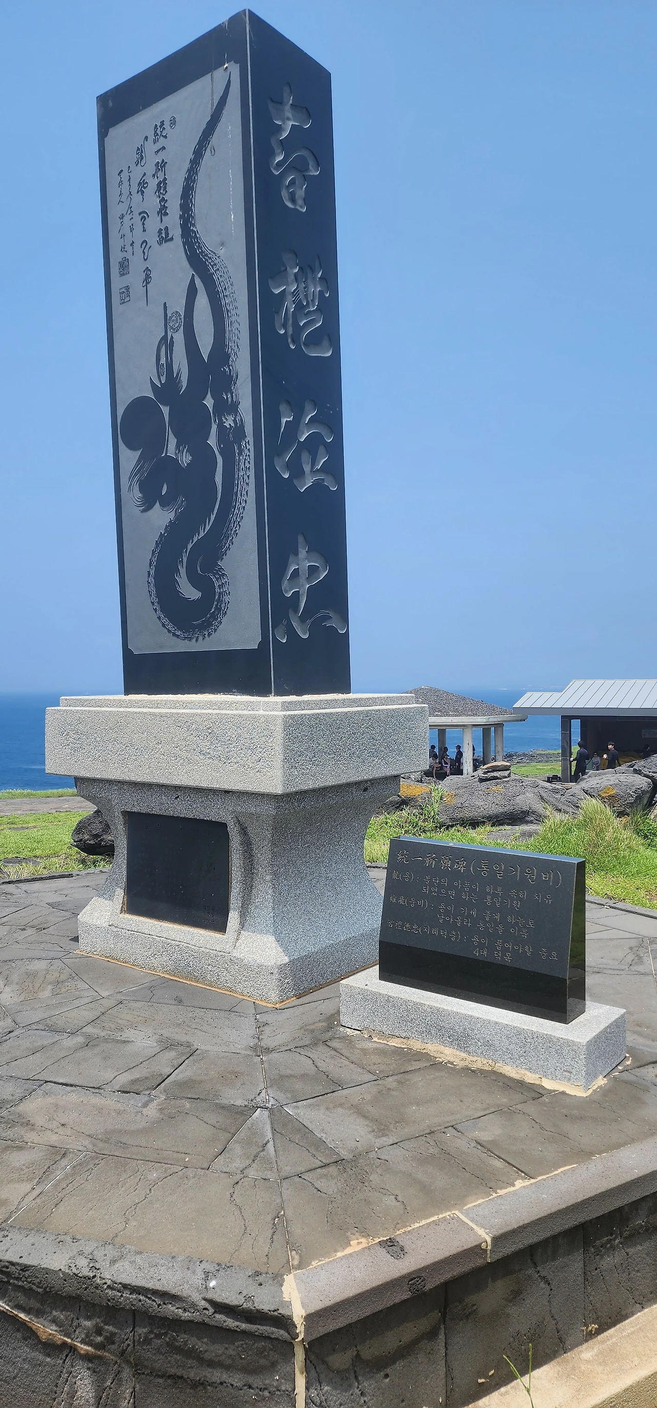 시계를 보니 30분 정도 남았다, 못 가본 해안가를 서둘러 가볼까 생각하다가 그냥 그늘에서 쉬기로 한다. 폭염에 습기로 온몸이 끈적끈적하다. 배를 타기 전 선착장 앞에 있는 통일기원비를 발견하고 사진에 남겨둔다. 요즘처럼 통일이 멀게만 느껴지는 시국에 소중한 기원비다. 저 멀리 다시 운진항으로 돌아갈 배가 보인다. 마라도를 이제는 떠난다. 안녕 마라도, 최남단의 막내섬이여.