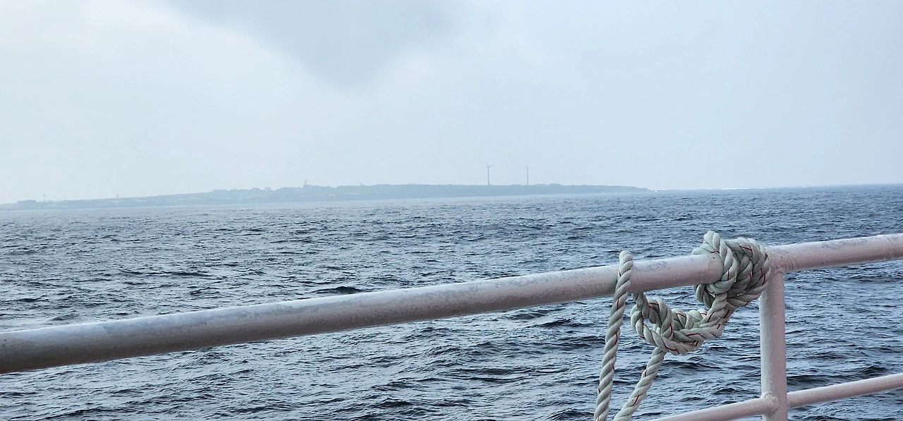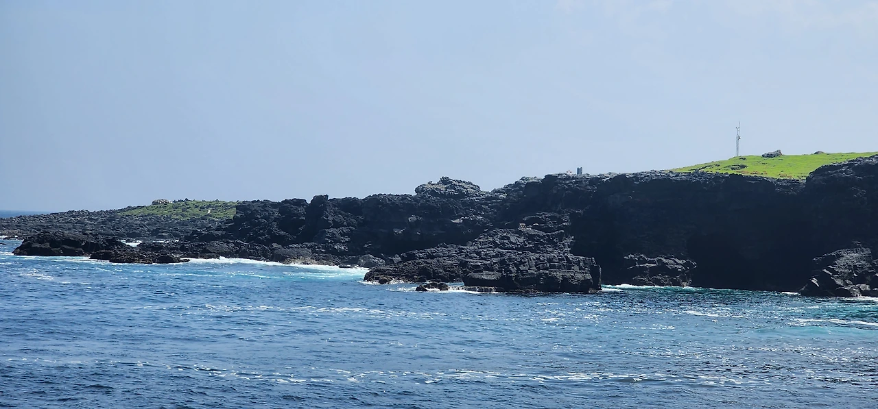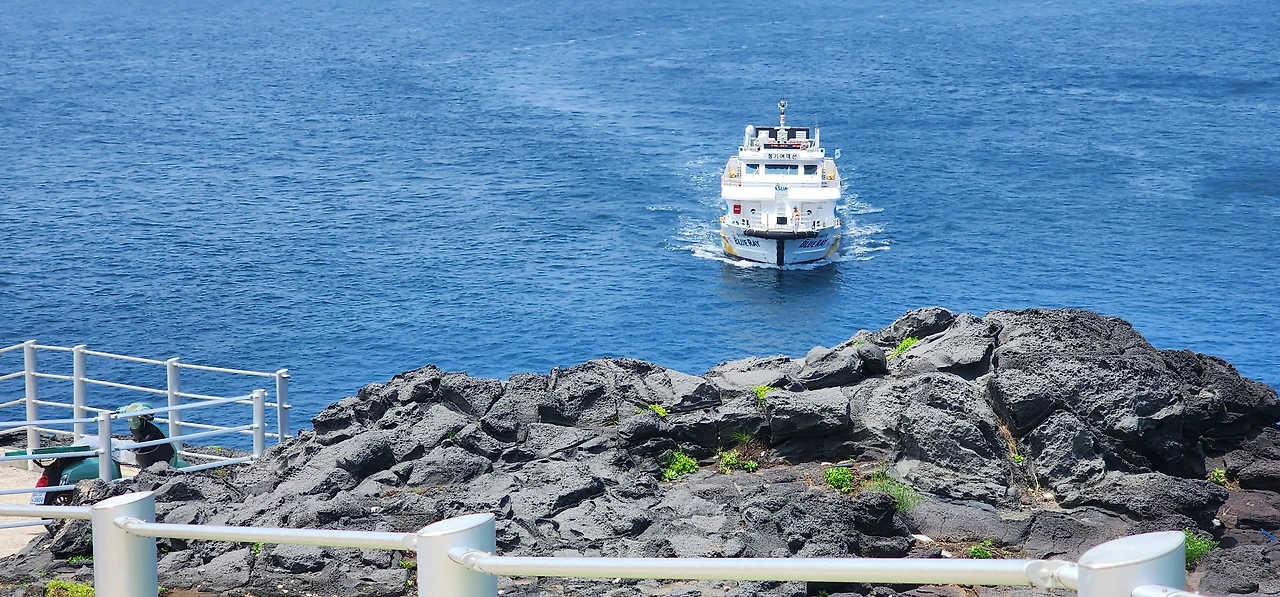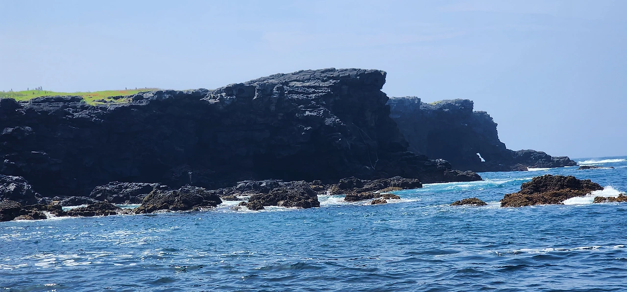 드디어 마라도행 배가 떠난다. 어쨌든 마라도를 볼 수 있게 되었다. 설레는 맘으로 2층에 올라 실외로 나가 바다와 바람을 만끽한다. 배가 가파도를 왼편으로 끼고 계속 전진한다. 나는 마라도행 배 위에서 가파도를 찍어둔다. 25분쯤 지났을까? 마라도가 눈앞에 들어온다. 절벽을 끼고 서 있는 대한민국 최남단 마라도다.