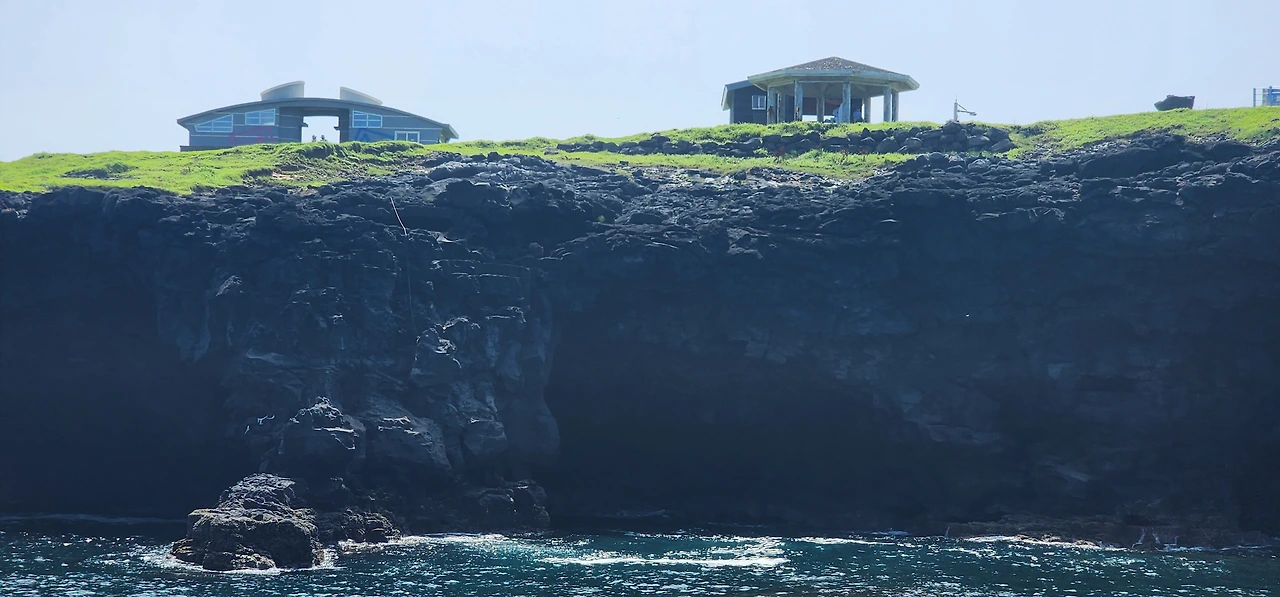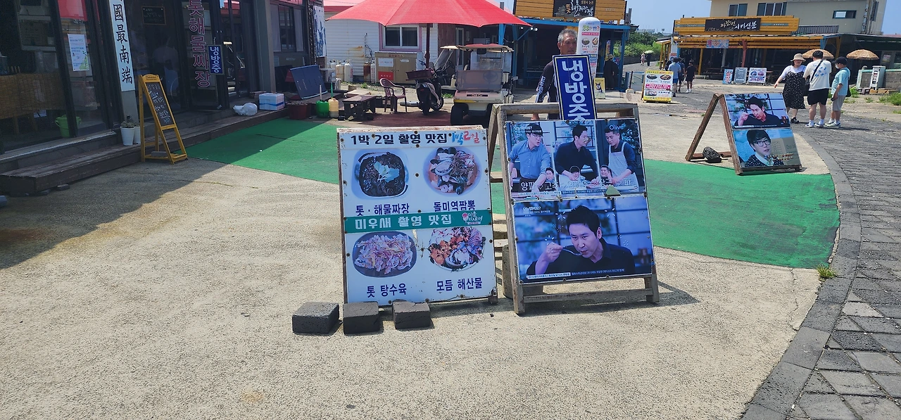 드디어 마라도에 다가간다.마라도에 내리니 선착장에서 50 계단쯤 걸어 올라야 섬의 평지에 다다를 수 있다. 마라도는 오로지 도보로만 여행할 수 있다. 평지에 오르니(?) 제일 먼저 눈에 띄는 것은, 24시간 편의점과 짜장면집. (마라도에는 정말 짜장면집이 많다. TV광고가 만든 과잉상품이다. 게다가 24시간 편의점이 2개나 있다. 가파도는 하나도 없는데.ㅠㅠ) 심지어는 전기차로 실어 나르는 호객행위도 한다.