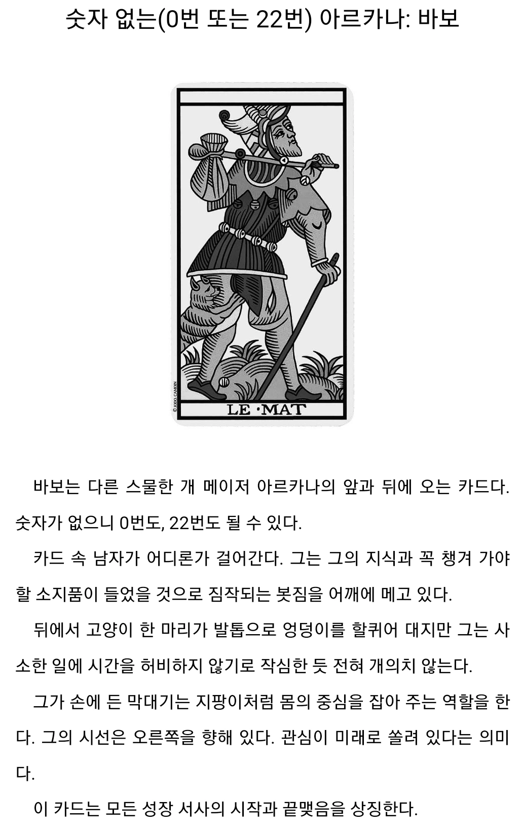 "나는 바보 카드와 함께 다시 출발점에 섰다. 그것은 삶이라는 여정의 앞과 뒤에 위치하는 카드다. 모든 것을 이룬 지금, 나는 봇짐을 어깨에 메고 수시로 엉덩이를 할퀴어 나를 깨어 있게 해주는 고양이 한 마리와 함께 다시 길을 떠난다."(469쪽)