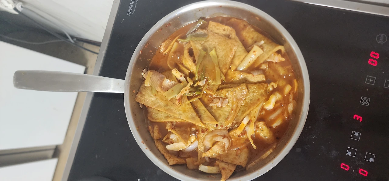 떡볶이는 어묵을 듬뿍 넣고, 밀떡을 썼다. 고추장이 아닌 고춧가루 베이스로 만들었다.