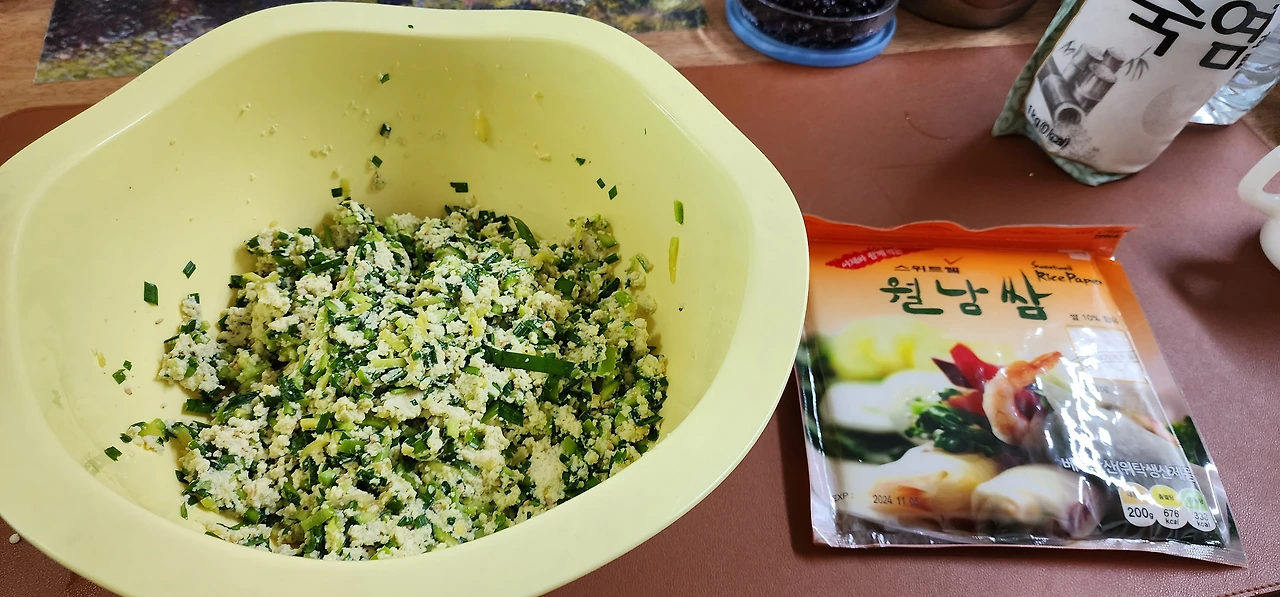 그렇게 해서 부추전, 감자볶음, 떡볶이, 된장찌개 등을 새로운 레시피로 도전하여 그럭저럭 성공한 경험이 있다. 그때 해먹고 싶었으나 재료가 없어 못 해먹은 요리가 애호박 만두였다. 애호박과 두부와 청양고추는 있었는데, 결정적으로 라이스페이퍼가 없었다. (물론 밀가루를 반죽해서 피를 만들면 되지만 그건 공정이 복잡해진다.)