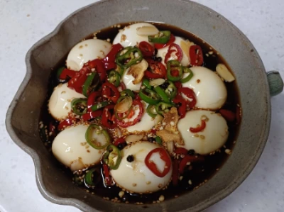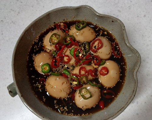 반숙 달걀에 양념장을 샤워하듯 골고루 뿌린다. 한두 시간 후 달걀을 뒤집어 주어 양념장이 골고루 배이게 한다.