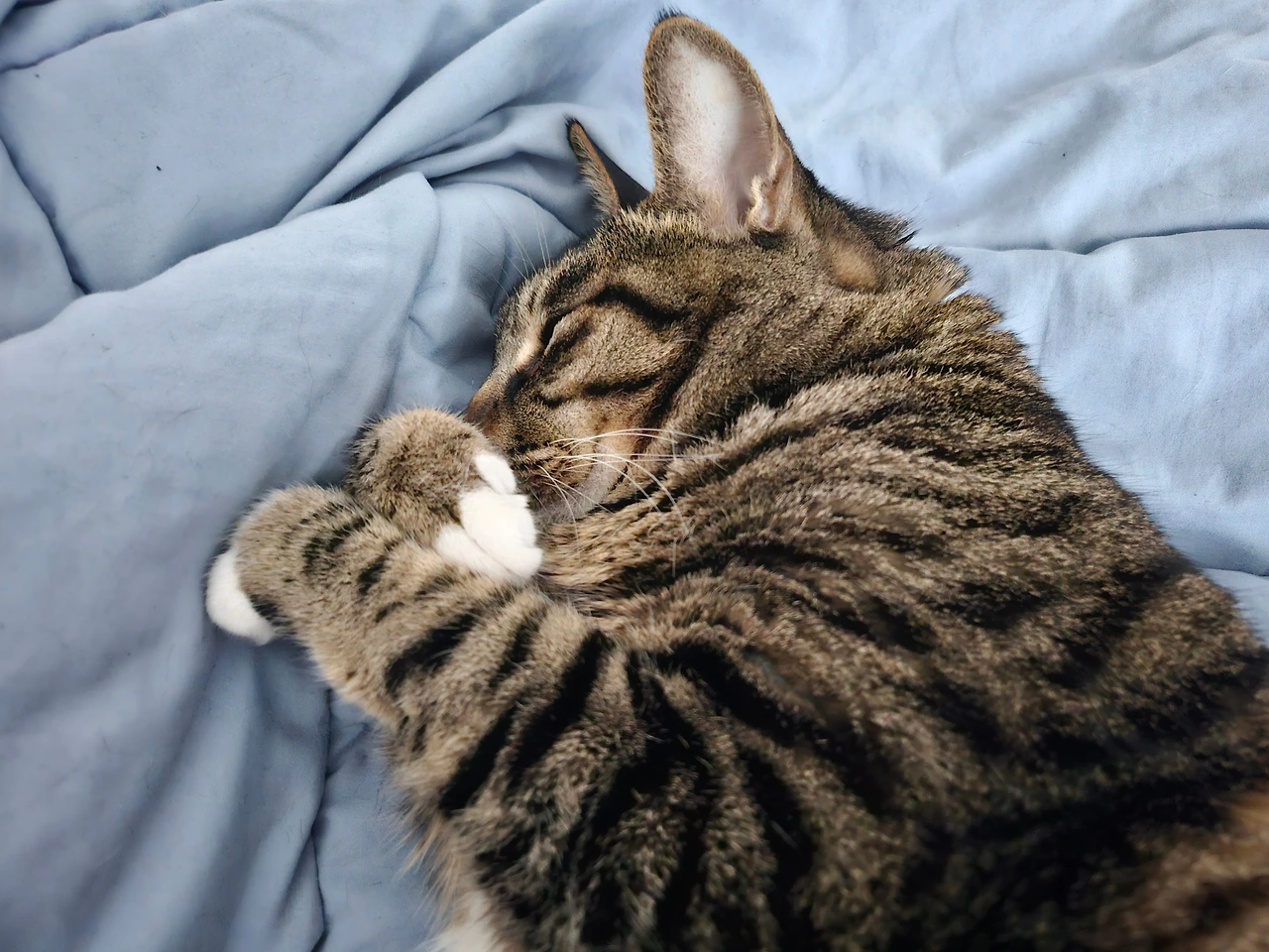 고양이가 잠이 들면 하얀 배에 얼굴을 묻고 그 부드러움을 만끽한다.