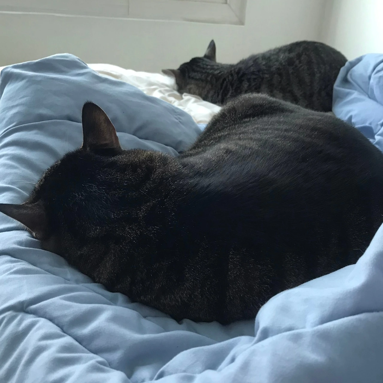 세 마리의 고양이가 침대 위에서