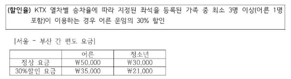 5번 문제. 다음은 KTX 열차의 ‘다자녀 행복’ 할인 제도의 할인율을 설명한 내용이다. 두 중학생 자녀를 둔 부부가 이 할인 제도를 이용하여 ‘서울 – 부산’ 구간의 왕복 승차권을 구입할 때, 총 구매 금액은?