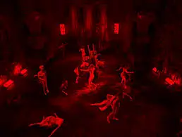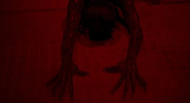 ​​​극초반에 등장한 영화의 시대적 배경인 동서독의 사회주의 사상의 온상지에 만연한 테러에 평행적 이미지를 부여하여 이곳에 있는 패트리샤와 사라, 그 이외에 존재하는 무용학원의 학생들은 전부 시대상에 불필요하게 발생한 피해자로서 그려지고 이는 자궁이 존재하는 복부 부분의 이분을 통하여 꺼내는 장기를 마치 태아의 탯줄처럼 비추어 재탄생한 시스템의 또 하나의 산물이라는 것을 굉장히 은유적으로 드러냅니다. 그러고 난 후, 무용학원의 시스템을 위협할 마치 갈라진 배속으로 들어갈 것 같은 수지의 직선성이 드러납니다. 그리고 이런 복잡한 구조로 이루어진 조그마한 시스템을 비추는 스크린을 붉게 물들여 마치 시스템의 종말을 암시하는 시퀀스를 시작합니다.