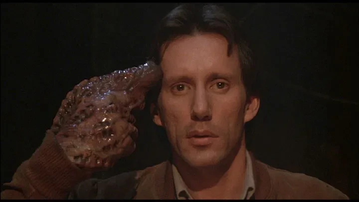 '미디어는 메시지다'라는 부분에서 영감을 얻은 스크린에 비친 인물(주인공과 육체적 사랑을 나눈)이 비디오드롬이라는 괴물에 의해 목이 졸려 죽음을 맞이하는 장면을 통해 정작 중요한 미디어 밖의 세상을 철저히 배제시키고 오직 미디어가 2차원의 틀에서 전하는 메시지에만 집중하여 미디어는 그런 영상물을 담은 네모난 비디오테이프를 담는 무생물의 존재 그 이상으로 서로 대화하는 유기체라는 난해한 이론을 아주 명시적으로 시각화합니다. 그리고 마침내 가학성과 선정성을 상징하는 외계 문명처럼 꾸며진 비디오드롬이 만들어지는 세트장에서 유혹의 상징체인 인물이 넣었던 비디오가 전달하는 '비디오드롬에서부터 자유를'이라는 메시지를 주입받은 주인공의 손과 총이 살이 엉켜 결합된 기괴한 모습으로 모든 것을 담당하는 사회자를 죽이고 난 뒤 주인공 앞에 놓인 살로 뒤덮인 텔레비전이 총상을 입어 피를 흘리는 장면이 비디오드롬이라는 무감각한 폭력성을 담당하는 주인공이 스스로를 쏘는 장면과 병치되어 텔레비전이 파괴되는 모습이 마치 숙주를 옮겨 다니는 기생충처럼 비디오드롬이라는 메시지가 주인공이라는 숙주로부터 해방되어 또 다른 이들에게 영향력을 미치는 악순환적 구조를 그려내어 현대인의 비극을 그려냅니다.