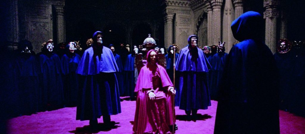 하지만 어떤 가면을 쓴 여인이 윌리엄 박사에게 경고를 날립니다. 여기를 당장 벗어나라고. 하지만 숨겨진 욕망을 분출하고 싶었던 윌리엄 박사는 이런 경고를 무시한 채 당장 눈앞에 놓인 쾌락의 일련을 목격하고 싶은 욕망이 큰 상태이기에, 그녀의 말을 무시합니다. 그리고 이윽고 눈을 가린 맹인을 연상케 하는 피아노 연주자와 가면을 덮은 상태에서 성스러운 오르골 음악이 나오면서 마치 마녀사냥과 같은 의식을 치르는 것 같이 모순적인 요소들의 조합으로 균형적이고 차분한 선율을 지닌 대칭성의 이미지와의 조합으로 부조화 속의 조화를 이루며 윌리엄 박사를 부릅니다. 그곳에서 왕의 자리에 오른 것 같은 남자가 그에게 가면을 벗고 본모습을 드러내라는 말을 하며 위협감을 조성합니다. 그런 그의 모습을 긴 호흡을 통해 미디엄 클로즈 업으로 프레이밍 한 후 윌리엄 박사의 시점 샷, 가면을 쓴 무리들 뒤에 숨은 모습에서의 관음적 시점 샷과 정면 샷을 포함해서 박사에게 다가왔던 의문의 여성이 위 층에서 그 상황을 마치 전지적 시점에서 바라보는 로우 앵글과 부감 샷으로 비추는 인서트 샷을 연속적으로 배치하여 대치의 상황을 긴장감 있게 그려냅니다.