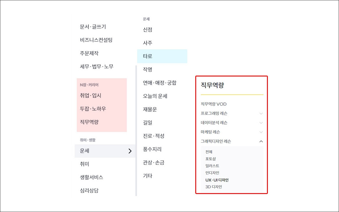 2년 만에 다시 찾은 고향(?)에는 전에 없던 카테고리가 추가되어있었다. 가장 먼저 [N잡∙커리어] 카테고리가 눈에 들어왔다. 전문성만 있다면, 하나의 재능에서 그치지 않고 가지를 넓히고 확장하며 다양한 수익구조를 만들 수 있을 것 같아 보였다. 과거에는 주로 트위터에서 랜선 사수 존잘님들의 인사이트를 줍줍 하곤 했었는데, 요즘에는 커피챗이나 멘토링을 통해 커리어 역량을 강화할 수 있는 서비스들이 많이 생긴 것 같다.