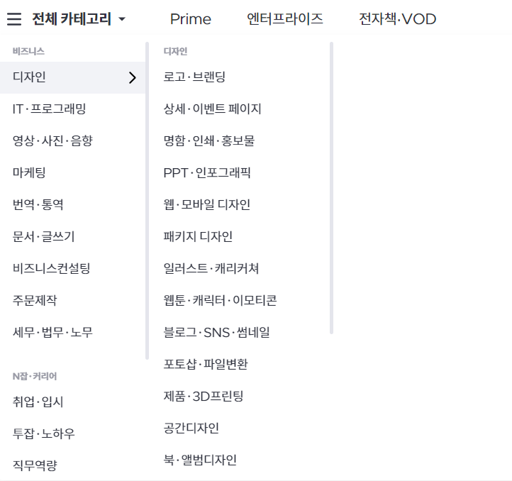 당시만 해도 N잡을 쉽게 구할 수 있는 플랫폼이 희소했다. 크몽에서는 손품을 팔아, 제안을 많이 보내는 만큼 다양한 프로젝트를 수주할 수 있었다. 2년 만에 웹사이트를 방문해보니, 카테고리가 더 다양해져 있었다.