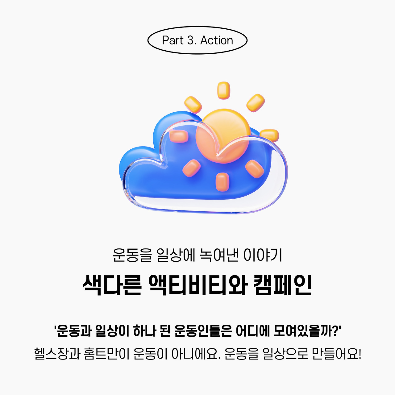 헬스장이나 홈트가 아닌 방법으로 운동을 일상에 녹여낸 이야기를 다룬다. 여행이나 여가의 일상에 녹여낼 수 있는 루트와 채널을 소개한다.