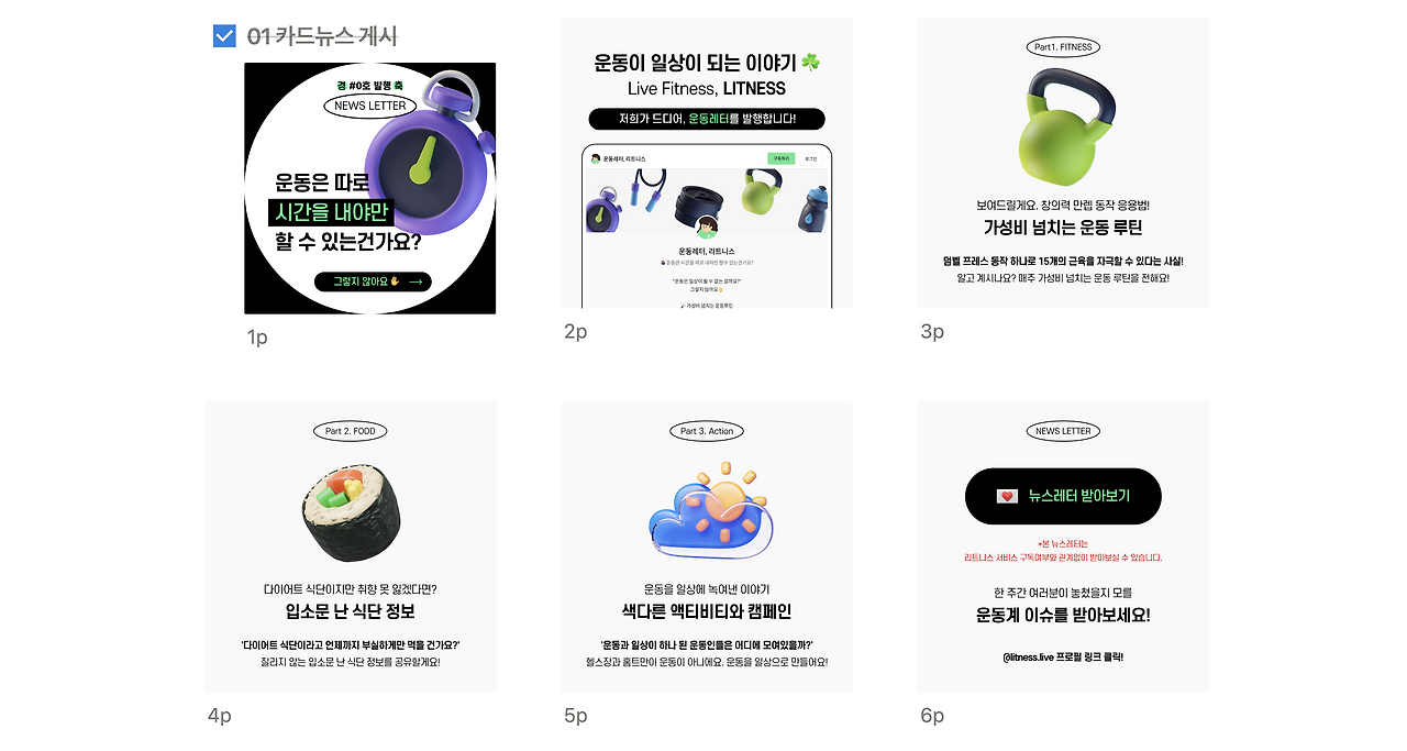 어떤 내용이 있으면 운동인들이 구독하고 싶어 할까? 운동인들에게 정말 필요한 정보는 무엇일까? 고민 끝에 운동 / 식단 / 캠페인이라는 큰 틀을 만들었다. 자세한 내용 설명은 아래와 같다.