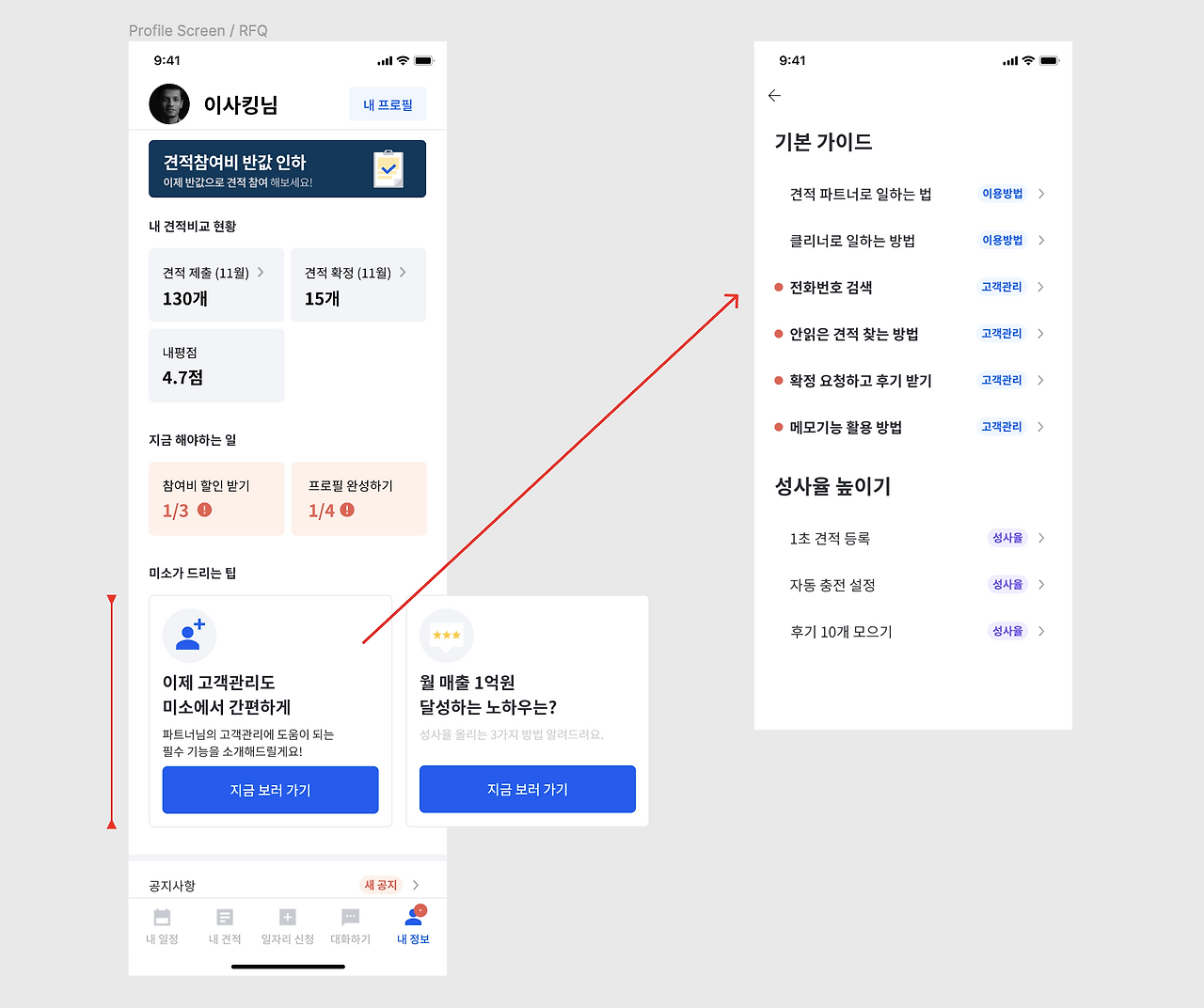 그리고 마지막으로 통합 공지사항 화면을 조금 개선해 봤어요. 개선 전 가이드 페이지도 공지사항의 before 화면과 유사했어요. 아직 읽지 않은 공지사항과 이미 읽은 공지사항의 구분이 더 명확히 되도록 개선했어요. 마이너한 작업이긴 하지만, 이를 통해 유저의 탐색이 좀 더 편해지고 미열람 가이드의 열람률이 높아지기를 기대했어요.