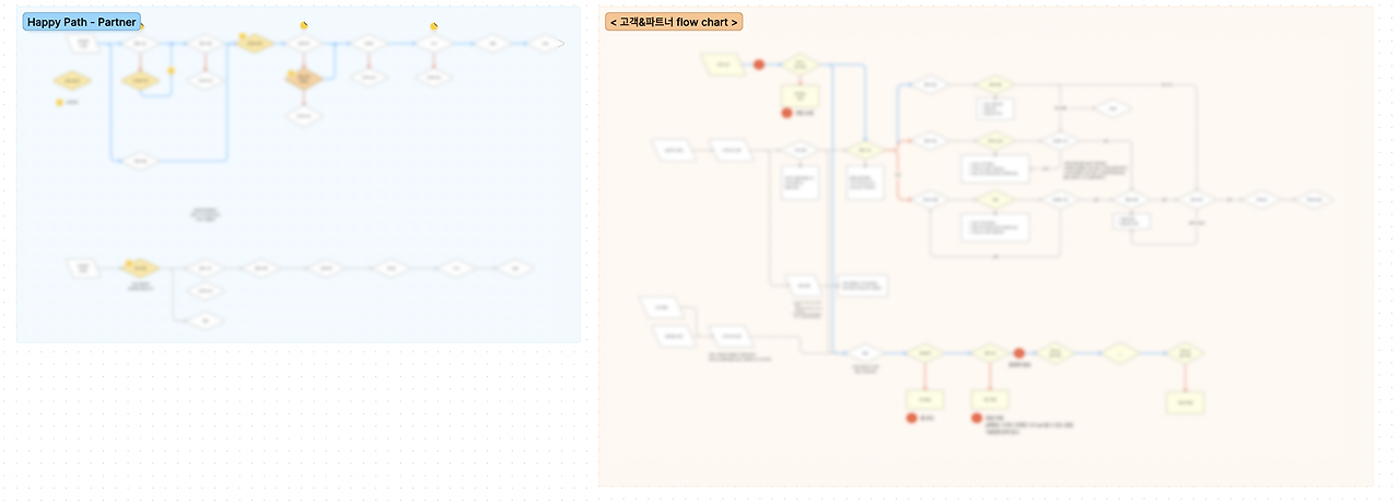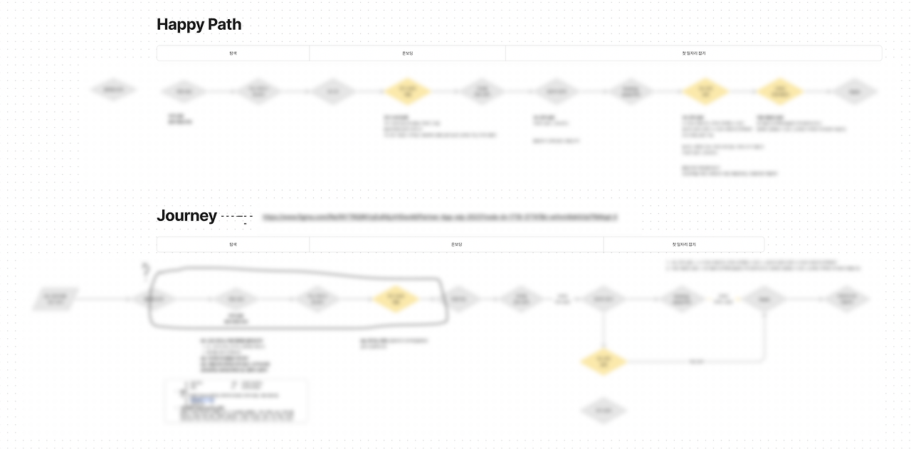 '자, 이제 유저 플로우를 완성했으니까, 해피패스를 그려볼까'라던지, '이미 완성된 해피패스라 수정하는 것은 곤란해'하는 식으로 흘러가지 않는다. 보편적으로 유저 플로우를 먼저 펼쳐 놓고 해피패스를 그리겠지만, 중간에 다시 유저 플로우로 갔다가 해피패스로 돌아오는 등 왔다 갔다 하며 완성도를 높여가는 것이 좋았다.
