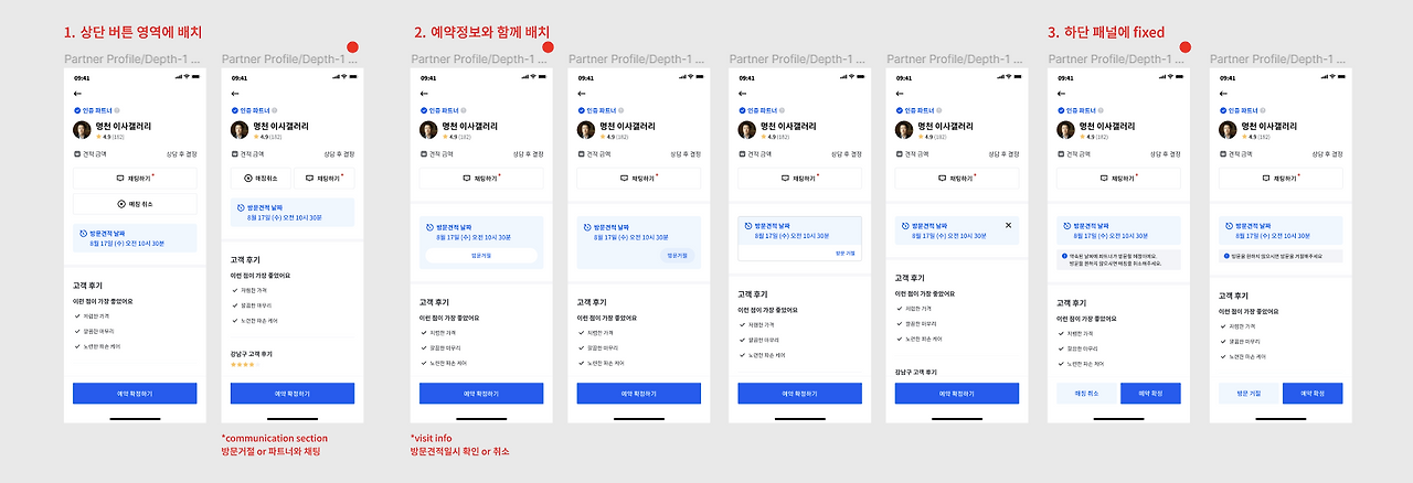 서비스 예약 단계에서 전체 프로세스 및 다음 단계에 대한 안내 정보 강화, 유저가 스스로 선택한 데이터를 명확하게 인지하도록 UI 개선