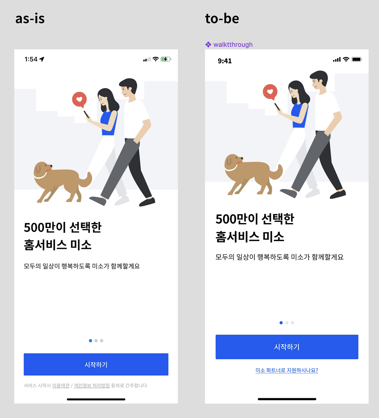 이용약관 내용을 뒤쪽 단계로 옮기고, [시작하기]를 눌러 가입하기 전에 '미소 파트너로 지원하시나요?'라고 묻는 텍스트 버튼을 배치했다. 그리고 이 작업은 다른 작업들의 우선순위에 밀려 무기한 연기되었다. ㅎㅎ 아쉬웠다. 지표에 얼마나 영향을 미치는지 까지 확인하고 싶었는데,