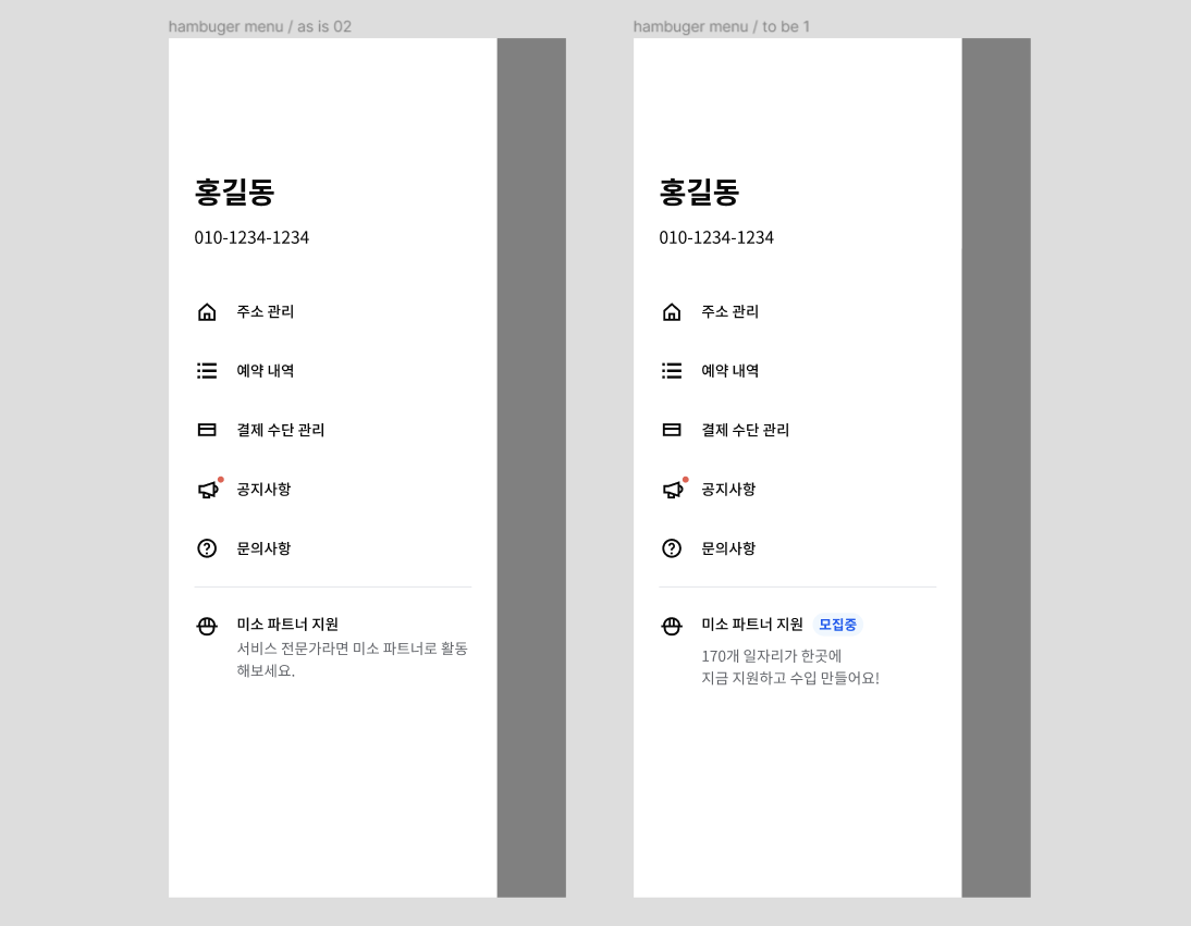 심증을 굳히기 위한 물증을 찾아다닌 결과, 고객앱의 햄버거 메뉴 안에 숨어있는 '미소 파트너 지원'배너를 통해 가입하는 파트너 유저의 수가 점차 늘어나고 있는 것을 발견할 수 있었고, 이 부분이 마케팅팀에서 공유해 주셨던 내용과 일치했다. 당시 공급 부족에 시달리고 있던 우리는 고객앱으로 잘못 들어온 파트너 한 명, 한 명 마저도 소중했다. 그래서 길을 잘못 든 파트너 유저에게 올바른 길을 안내하기 위해 두 가지 액션을 하기로 했다.