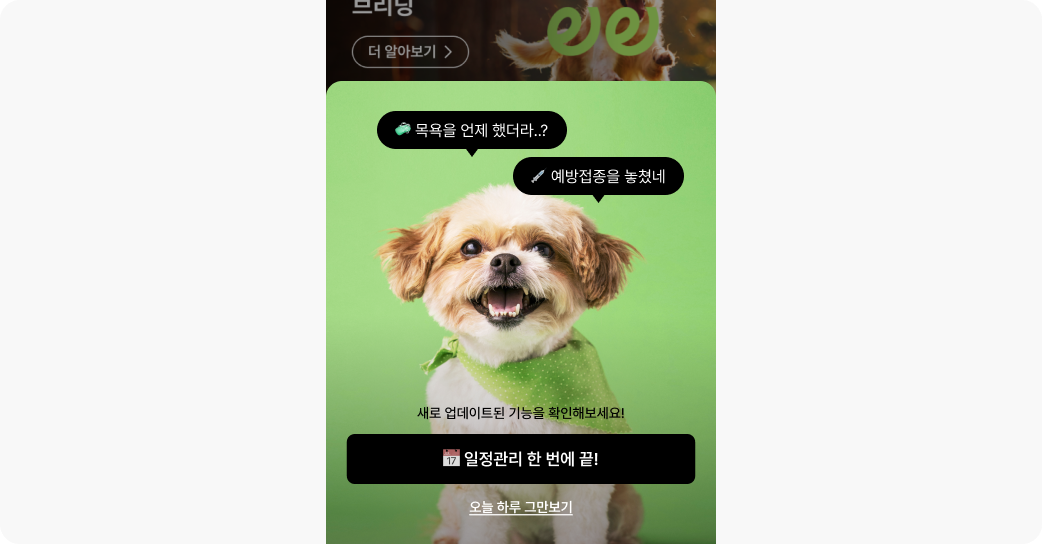 해당 기능을 사용하기 직전의 타이밍에 사용법을 안내하는 방법도 있다. 브리딩은 캘린더에 진입하기 전에 온보딩을 제공하고 있었는데 첫 장에 강아지 이름과 등록한 일정이 표시되는 게 인상적이었다. 첫 진입 시에는 랜덤 하게 뜬다.