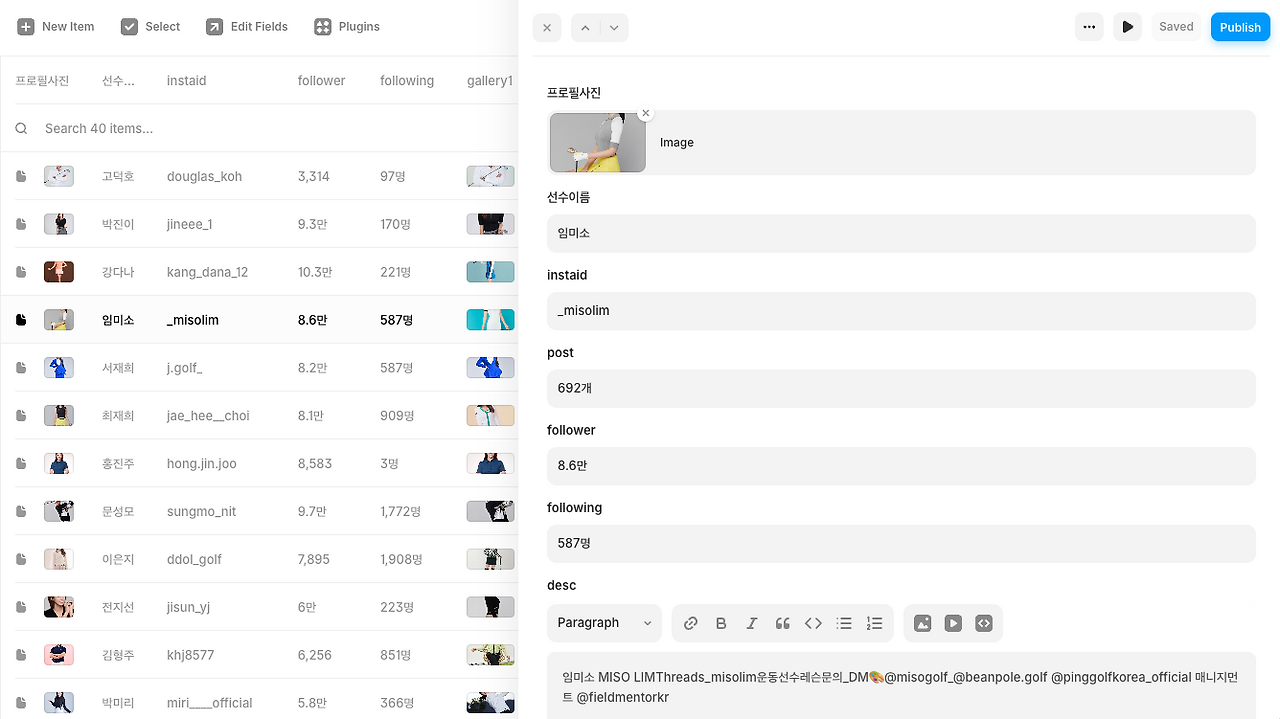 둘째 날, CMS 테이블을 세팅한다. 에이전시에서 인플루언서들의 프로필을 전시하는 사이트를 만든다고 가정해 보자. 이때 CMS로 인플로언서의 사진, 인스타 바이오, 섭외비용, 활동 범위 등 다양한 데이터의 필드를 생성하여, 엔지니어가 크롤링한 데이터를 전시할 수 있다.