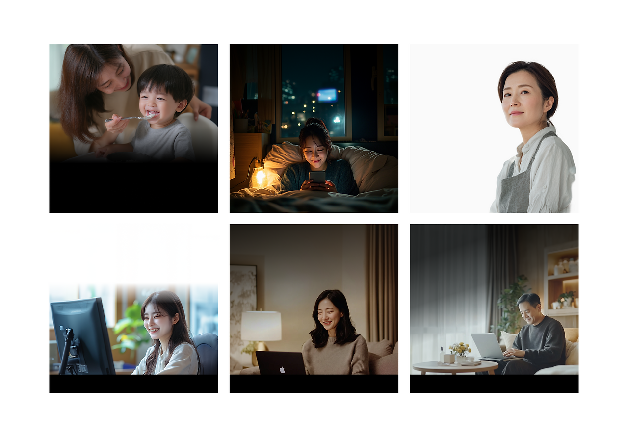 대체적으로 사진이나 일러스트는 미드저니가 잘 나오고, 3d 에셋은 지피티로 만들면 편했다. 초기에는 미드저니에서 한국 정서와 맞는 이미지를 뽑기가 어려웠는데, 이제는 프롬프트만 잘 작성하면 은퇴한 부장님이나 전업주부, 2030 청년들의 이미지도 꽤 잘 나오는 편이다. 하지만 여전히 묘하게 묻어나는 ai의 냄새를 잡는 건 숙제다.