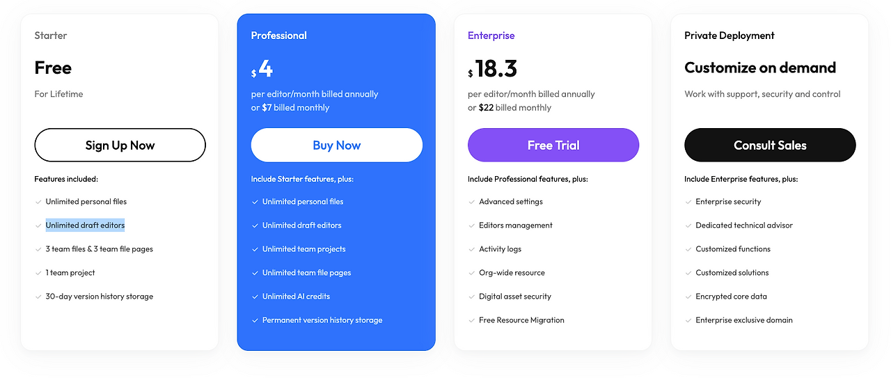 단지 무료니까 써보세요~만을 외치려고 했던 건 아니다. Pixso는 기업을 위한 좀 더 프라이빗한 플랜도 제공한다. Pixso의 프라이빗(Private) 버전은 기업 내부망 환경에서 사용할 수 있도록 설계되어, 데이터 보안과 자원 관리의 안정성을 보장한다. 기업 전용 서버에 배포하여 운영할 수 있으며, 회사 내부 링크를 통해서만 접근이 가능하기 때문에 외부 유출 위험 또한 최소화할 수 있다.