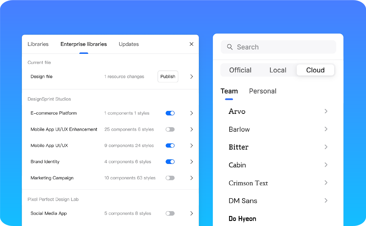 또한, 디자인 라이브러리(디자인 시스템, 컴포넌트, 이미지 등)를 자체 서버에 업로드하여 관리할 수 있어, 디자인 자산의 보안성과 일관성을 유지하기에도 좋다. 보다 자세한 내용은 프라이빗 버전 전담팀으로 문의할 수도 있다.
