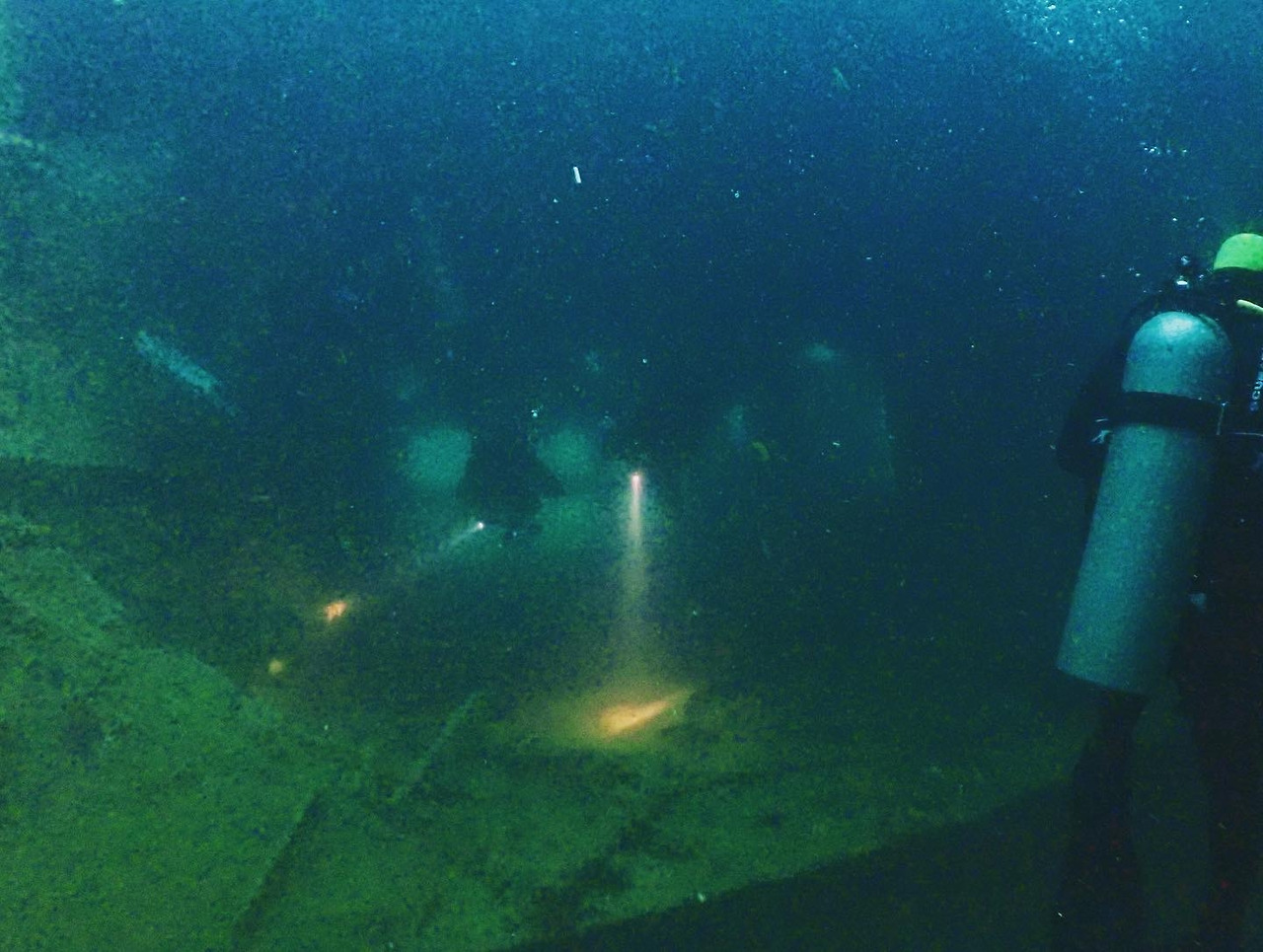빛을 따라 나오자 곧 출구가 보였다. 사방이 막혀있는 어두운 난파선의 내부를 벗어났다는 사실만으로 호흡이 정상적으로 돌아오는 것이 느껴졌다. 탁 트인 공간으로 나오자, 어디선가 희미하게 쇠가 부딪히며 내는 경쾌한 소리가 들려왔다. 탐침봉을 흔드는 소리였다. 잃어버린 일행 중 다른 한 명인 인스트럭터 쎈이 탐침봉을 흔드는 소리라는 것을 알아차릴 수 있었다. 소리가 멀리서 들려왔지만, 물속에서는 소리가 들려오는 방향을 가늠하는 일이 쉽지 않다. 마치 누군가가 나를 둘러싸고 사방에서 탐침봉을 흔드는 것처럼 사방에서 소리가 울리는 것 같이 들려오기 때문이다. 얼마간 주변을 두리번거리자 맥스가 탐침봉 소리가 들려오는 방향을 알아냈다. 이윽고 같은 방향에서 잃어버렸던 일행들이 이쪽으로 헤엄쳐 오는 것이 보였다.