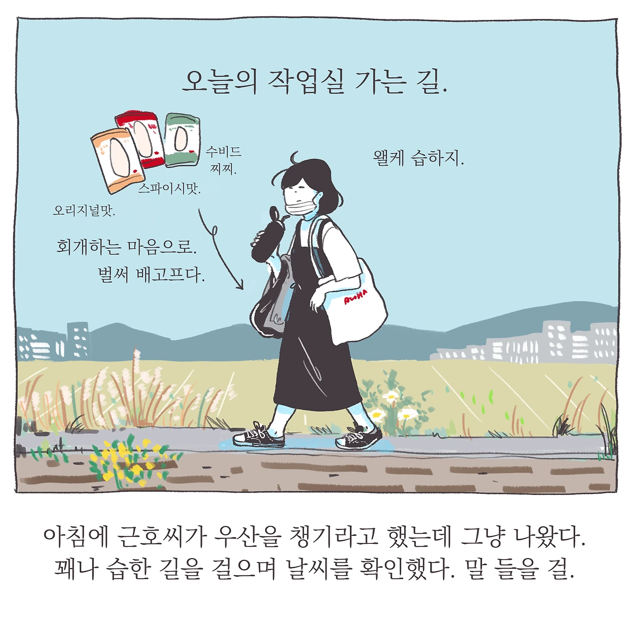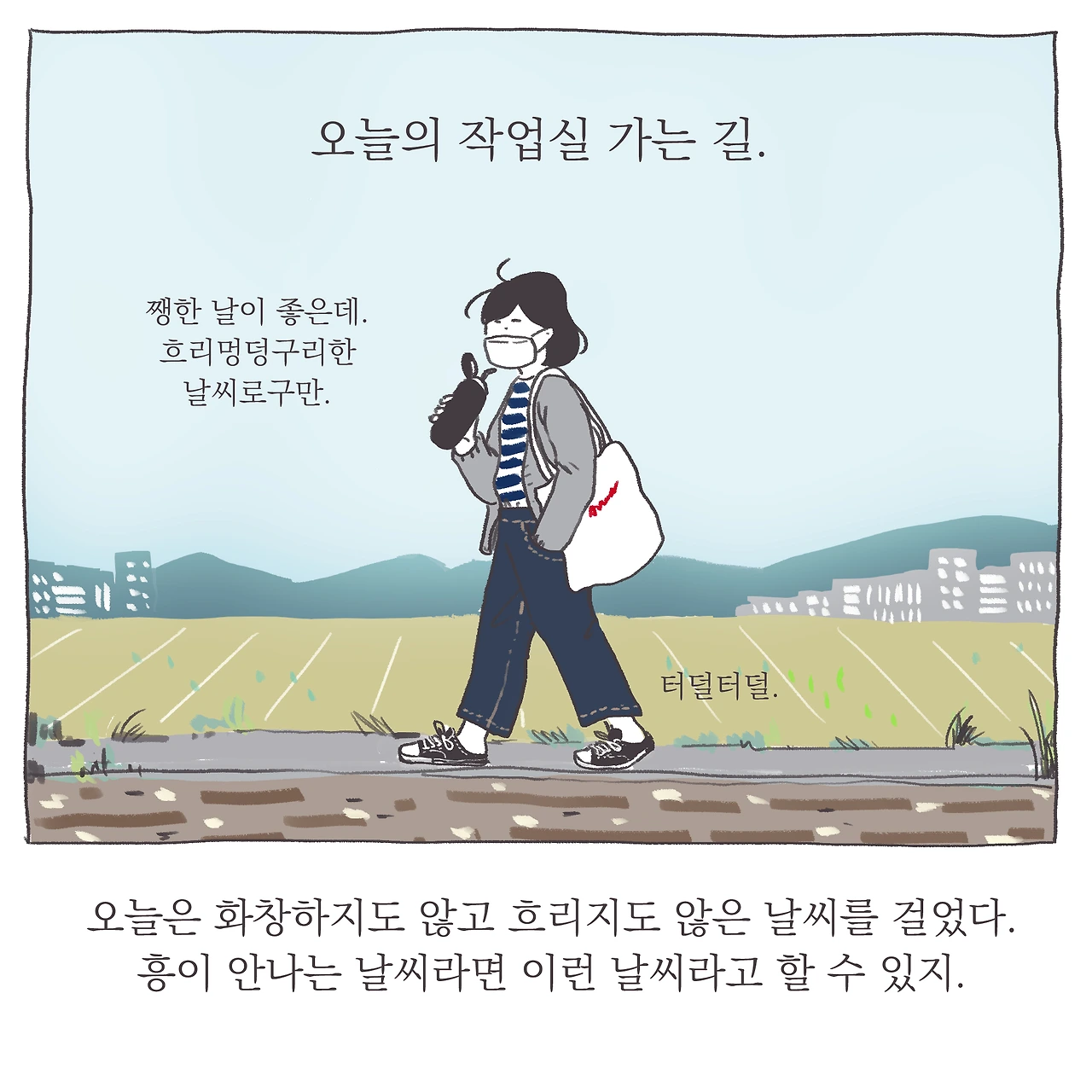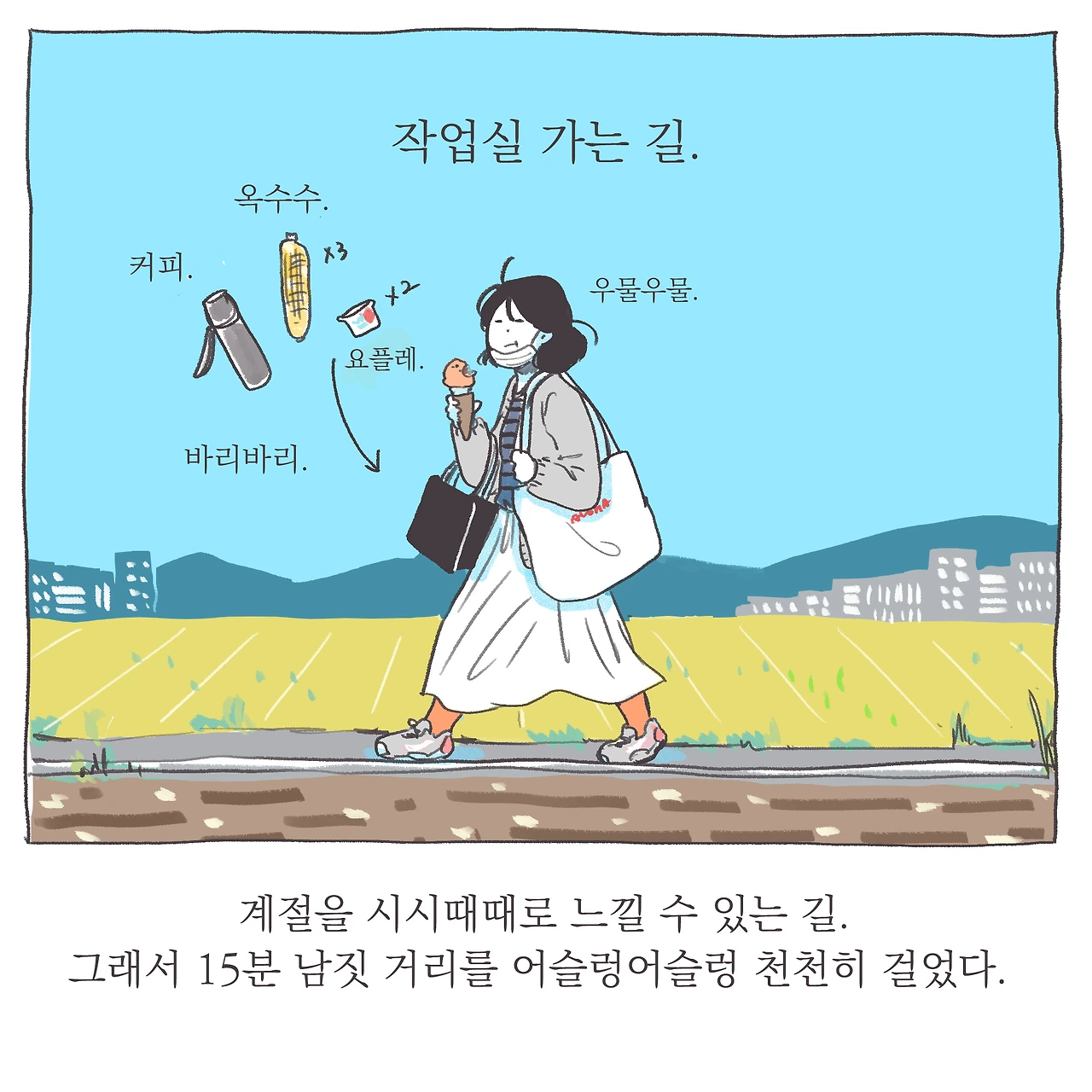 언젠가 이 매일의 길은 권태로운 일상이 될 것이다. 이 스치는 풍경도 분명 별일 아닌 익숙한 것들이 될 것이다. 과연 내가 언제까지 이 길 위에서 매일의 인상을 달리 느껴나갈 수 있을지는 모르겠다. 강박적으로 다름을 찾고싶진 않다. 그건 또 너무 부자연스러운걸. 그저 지금 그 길, 하루 하루 사소한 차이와 변화를 느끼고 기억해두는 일, 그리고 그것을 기록으로 남기는 일에 즐거움이 있으니 그것을 따를뿐. 확실히 즐거움은 행위지속에 강력한 동인이 된다는 걸 새삼 느끼며. . 하루하루 비슷한 컷을 생산해내는 일인데도, 어쩐지 이를 그리는 순간만큼은 그리는 일에 대한 단순하고 원초적인 애정 또는 즐거움을 느낀다. 스스로 조금 신기하다. . 마지막으로, 지난날 내가 그토록 닿고 싶었던 단단한 마음의 평안이란 참으로 별거 아니란 생각이 들기도 하고.