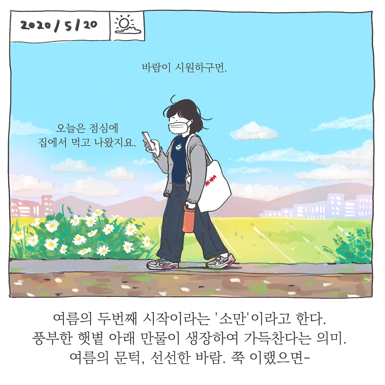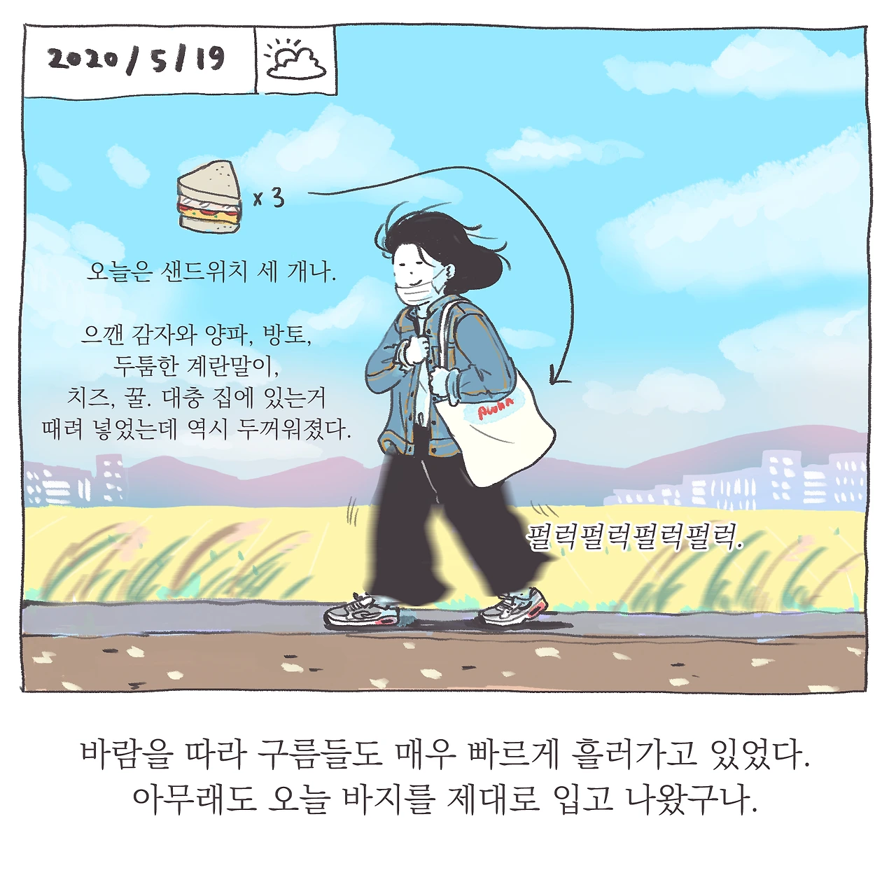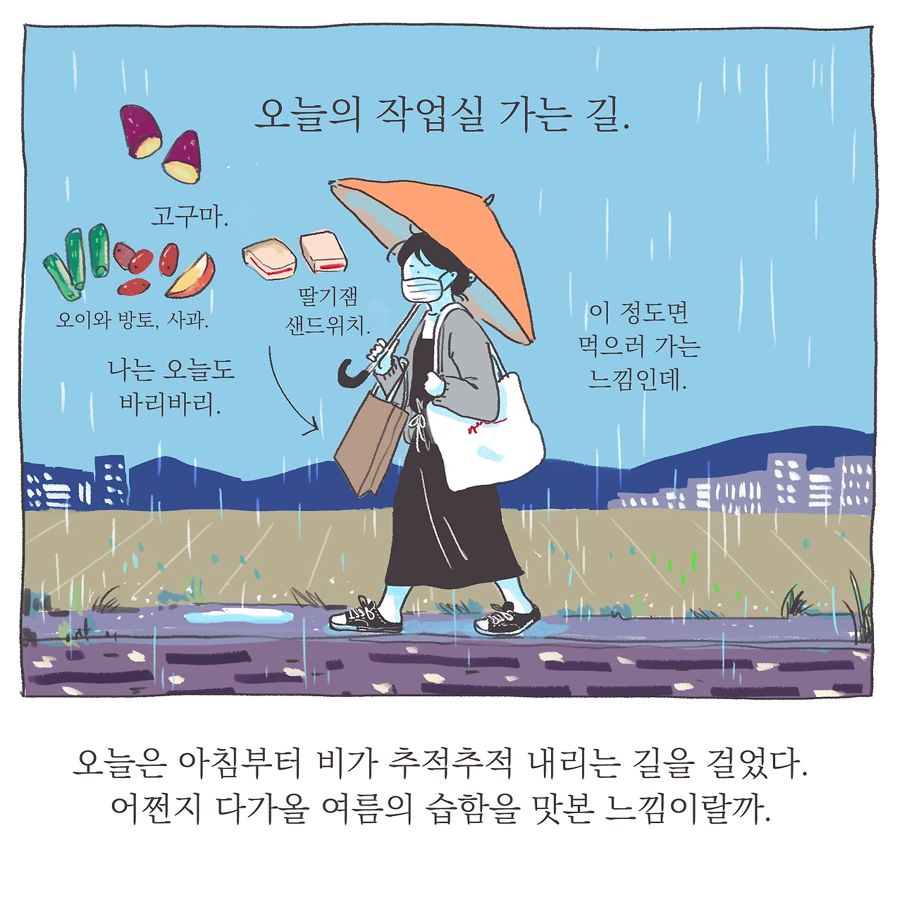 언젠가 이 매일의 길은 권태로운 일상이 될 것이다. 이 스치는 풍경도 분명 별일 아닌 익숙한 것들이 될 것이다. 과연 내가 언제까지 이 길 위에서 매일의 인상을 달리 느껴나갈 수 있을지는 모르겠다. 강박적으로 다름을 찾고싶진 않다. 그건 또 너무 부자연스러운걸. 그저 지금 그 길, 하루 하루 사소한 차이와 변화를 느끼고 기억해두는 일, 그리고 그것을 기록으로 남기는 일에 즐거움이 있으니 그것을 따를뿐. 확실히 즐거움은 행위지속에 강력한 동인이 된다는 걸 새삼 느끼며. . 하루하루 비슷한 컷을 생산해내는 일인데도, 어쩐지 이를 그리는 순간만큼은 그리는 일에 대한 단순하고 원초적인 애정 또는 즐거움을 느낀다. 스스로 조금 신기하다. . 마지막으로, 지난날 내가 그토록 닿고 싶었던 단단한 마음의 평안이란 참으로 별거 아니란 생각이 들기도 하고.