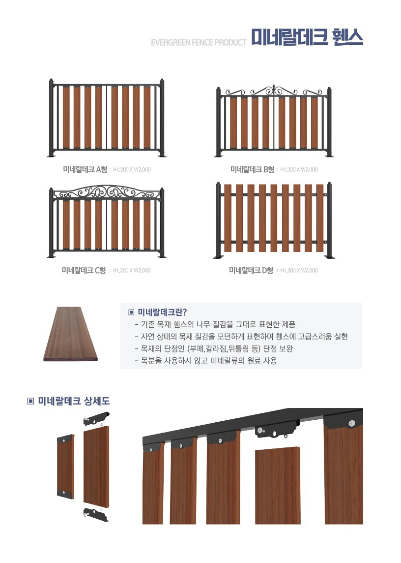 기본적으로 기둥과 가로바는 스틸구조로 되어있고 사이에 끼우는 자재는 미네랄합성데크로 이루져있습니다.