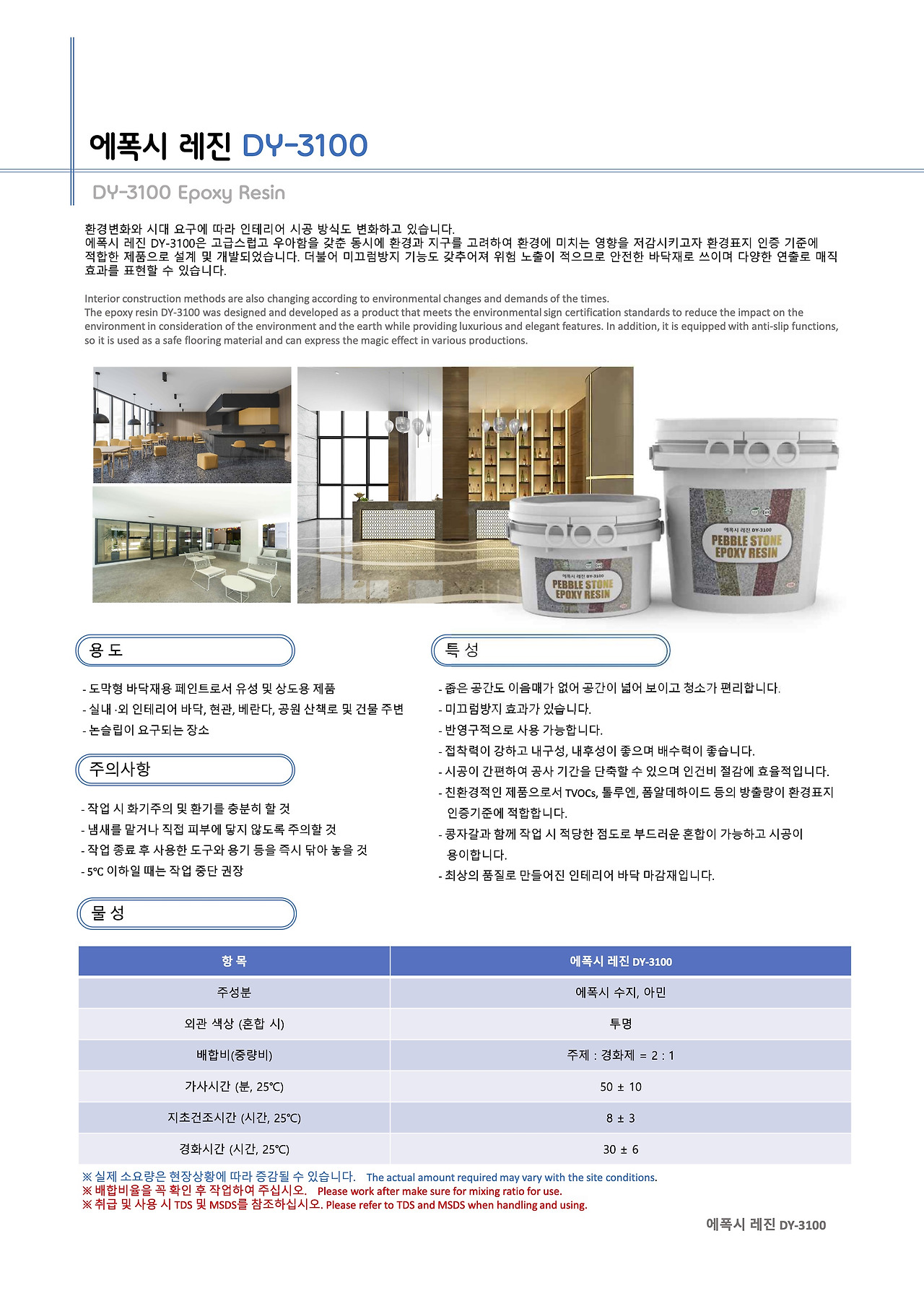 일반적으로 에폭시는 주제와 경화제 그리고 콩자갈을 혼합해서 사용합니다. 경화속도가 빠르다 보니 가급적 조금씩 부어서 사용해야 합니다. 또한 에폭시 주제와 경화제를 혼합해서 보관하면 굳어버리 때문에 가급적 사용할 때 혼합하기 바랍니다.