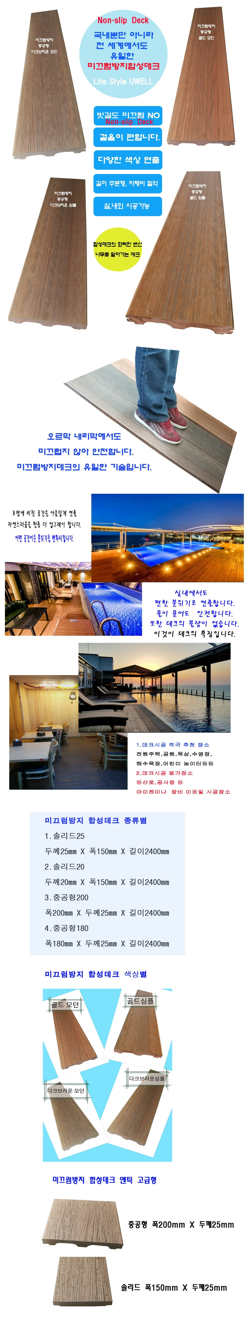 저희 데크는 미네랄 특 조개가루와 플라스틱을 혼합해서 만들었고 윗부분은 미끄럼방지 처리를 했습니다.