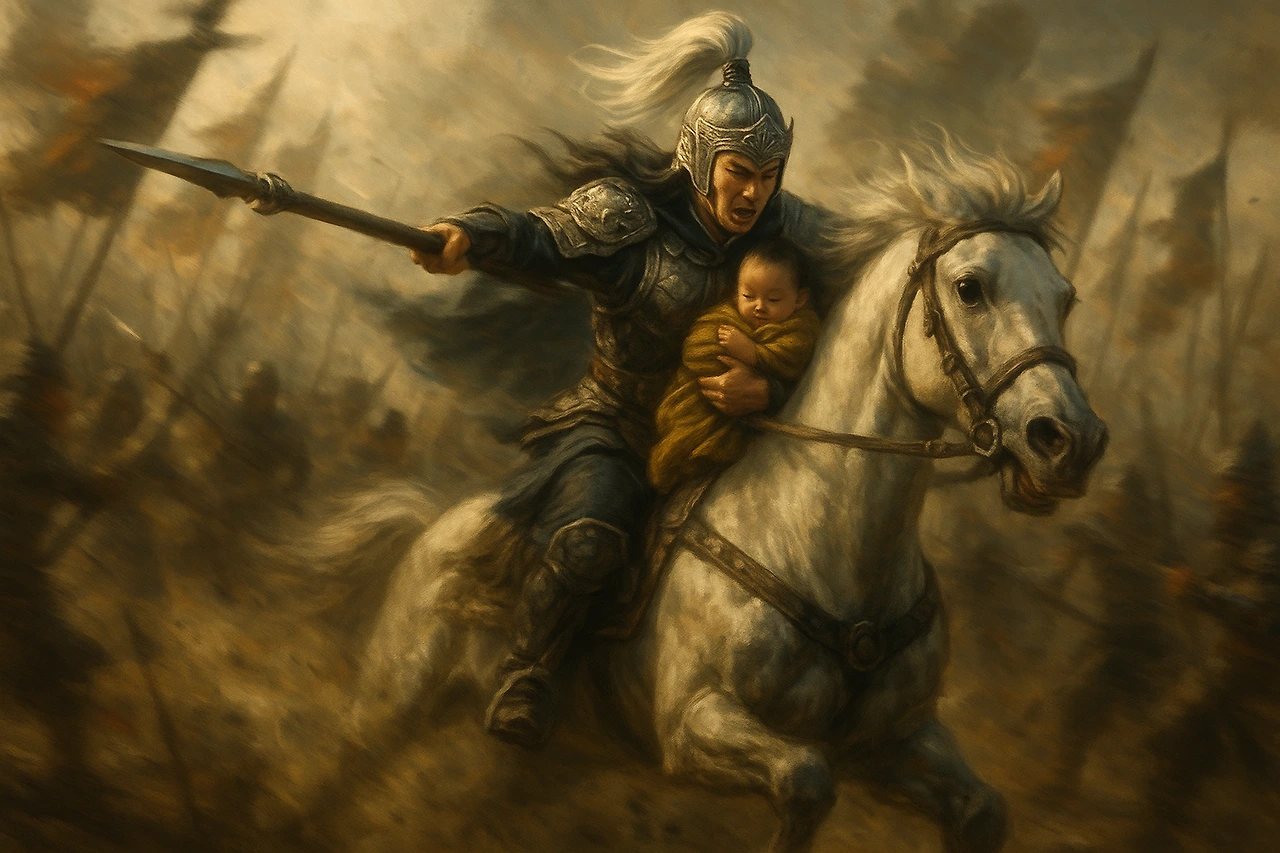 장판파 전투는 삼국지에서 가장 숨 막히는 장면 중 하나입니다. 조조의 대군에게 패하던 유비는 백성들과 함께 도망쳤지만, 혼란 속에서 어린 아들 아두(훗날 유선)와 부인 감씨가 적진에 떨어지고 말았습니다.